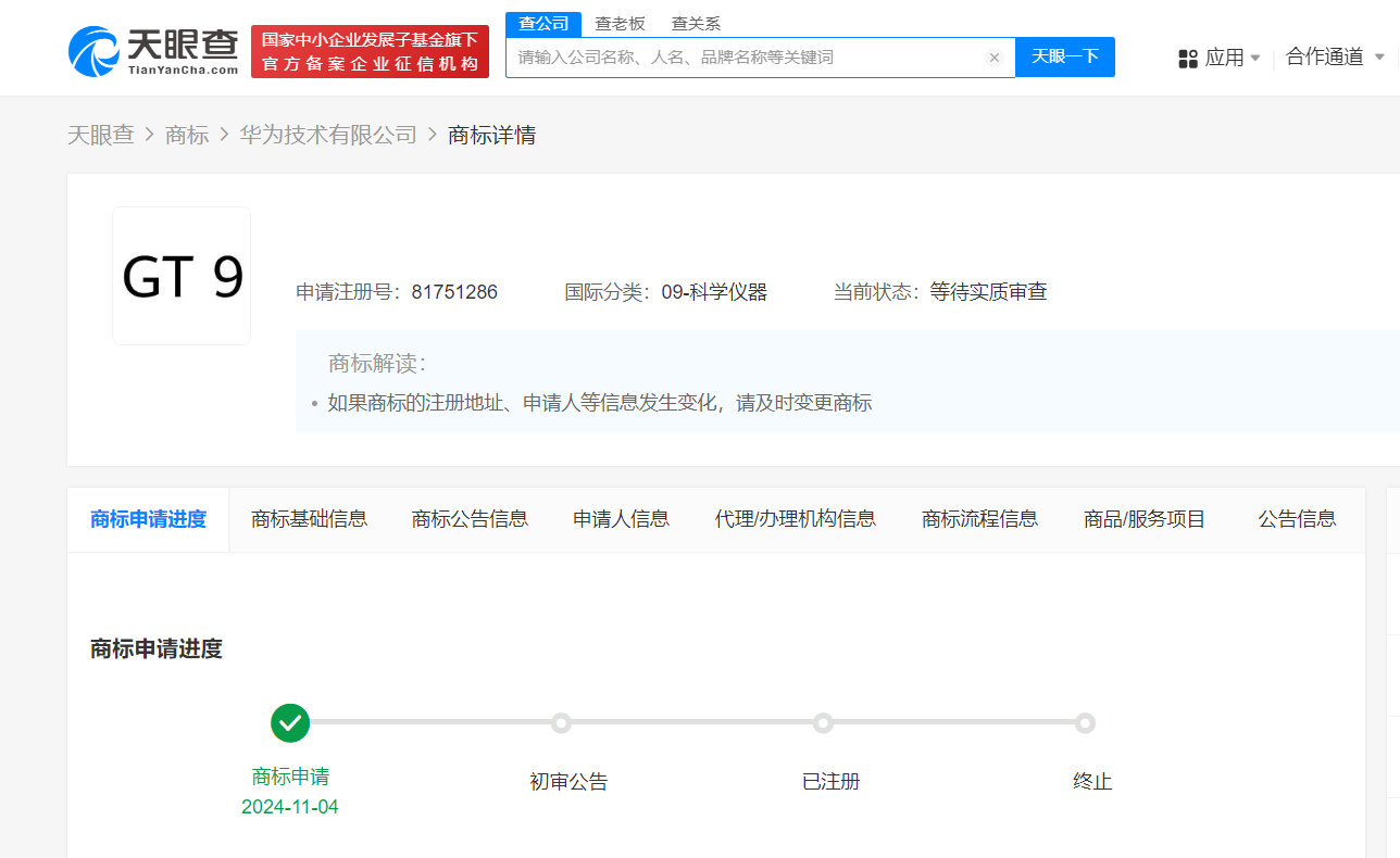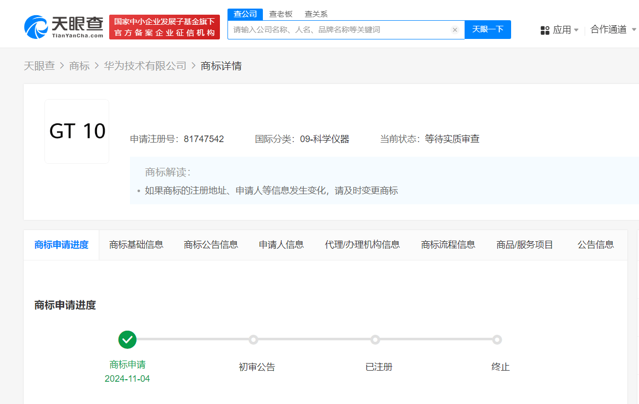 天眼查知识产权信息显示,近日,华为技术有限公司申请注册“GT 9”“GT 10”商标,国际分类为科学仪器,当前商标状态均为等待实质审查。