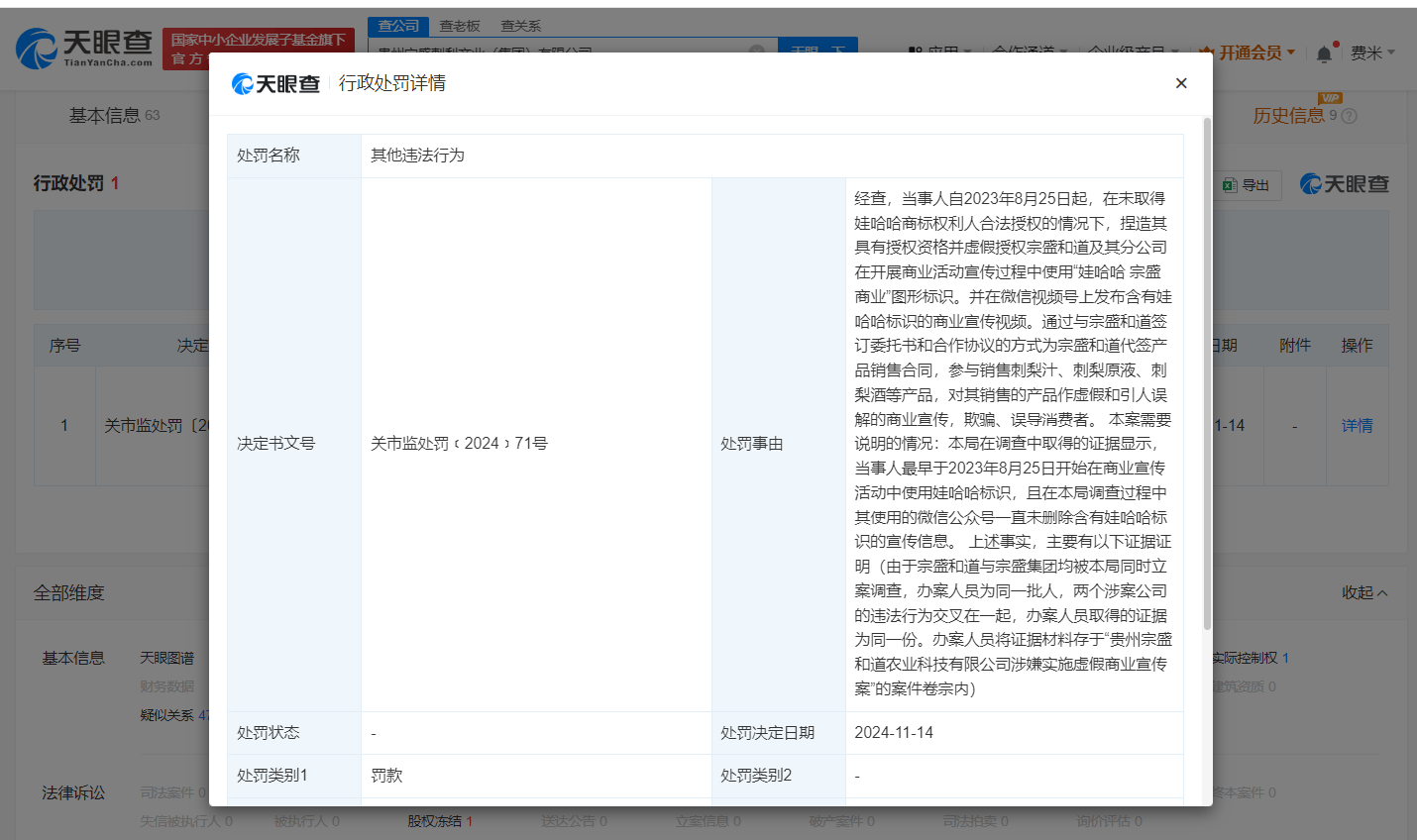 处罚事由显示,当事人自2023年8月25日起,在未取得娃哈哈商标权利人合法授权的情况下,捏造其具有授权资格并虚假授权宗盛和道及其分公司在开展商业活动宣传过程中使用“娃哈哈 宗盛商业”图形标识,并在微信视频号上发布含有娃哈哈标识的商业宣传视频。其通过与宗盛和道签订委托书和合作协议的方式为宗盛和道代签产品销售合同,参与销售刺梨汁、刺梨原液、刺梨酒等产品,对其销售的产品作虚假和引人误解的商业宣传,欺骗、误导消费者。