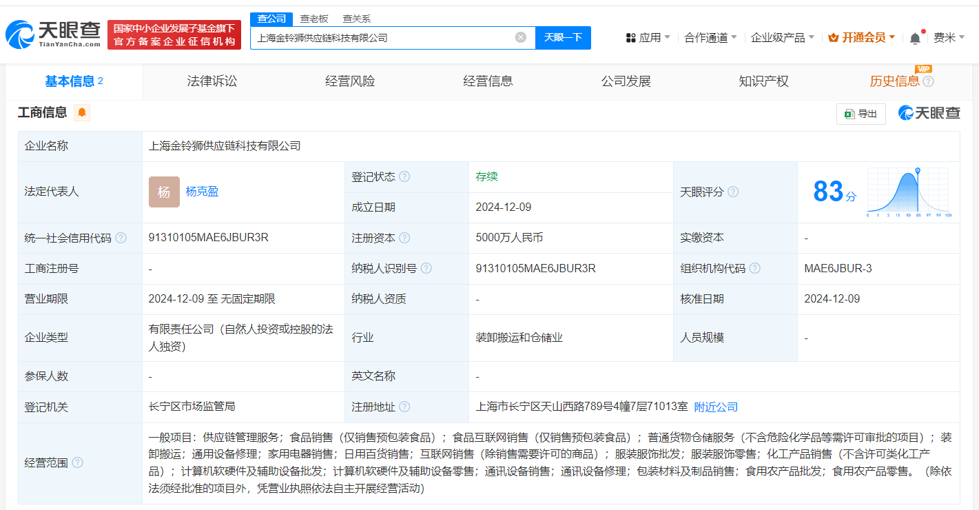 天眼查App显示,近日,上海金铃狮供应链科技有限公司成立,法定代表人为杨克盈,注册资本5000万人民币,经营范围含供应链管理服务、食品销售、食品互联网销售、普通货物仓储服务、装卸搬运、通用设备修理等,由福州塔斯汀餐饮管理有限公司全资持股。