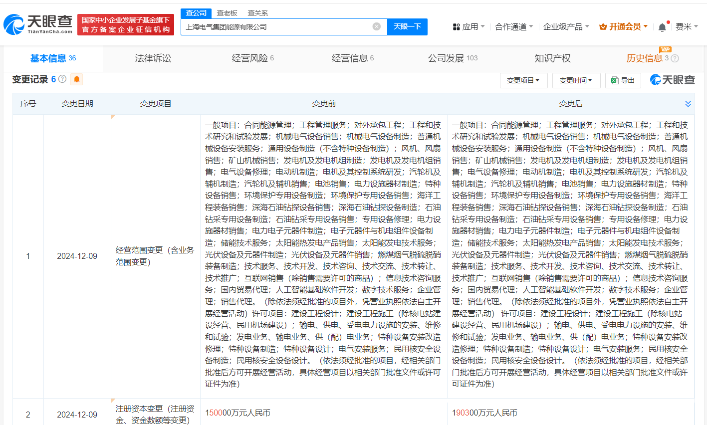天眼查App显示,近日,上海电气集团能源有限公司发生工商变更,注册资本由15亿人民币增至约19亿人民币,增幅约27%。