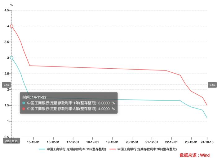 以大行工商银行(601398)为例,2014年末工行3年定期存款利率为4%,2015年10月下降至2.75%,2023年12月已跌至2%以下。