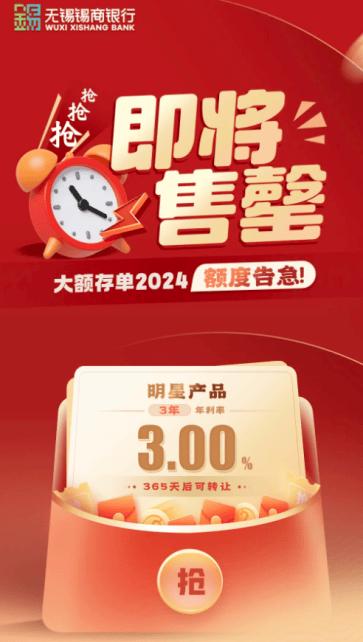 12月6日,无锡锡商银行公布,该行20万元起购的大额存单,三年期年利率达到了3%,365天之后可转让。
