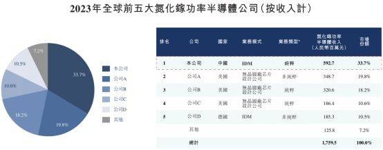 根据弗若斯特沙利文的统计,2023年,英诺赛科来自氮化镓功率半导体业务的收入在全球所有氮化镓功率半导体公司中排名首位,市场份额为33.7%。