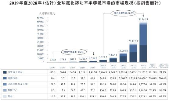 其中,氮化镓功率半导体产品在过去几年强势增长。其市场规模自2019年的人民币1.39亿元迅速增长至2023年的人民币17.6亿元,复合年增长率高达88.5%。而随着氮化镓技术越趋成熟以及下游应用范围更为广泛,2023年被视为氮化镓行业指数级增长的开局之年。