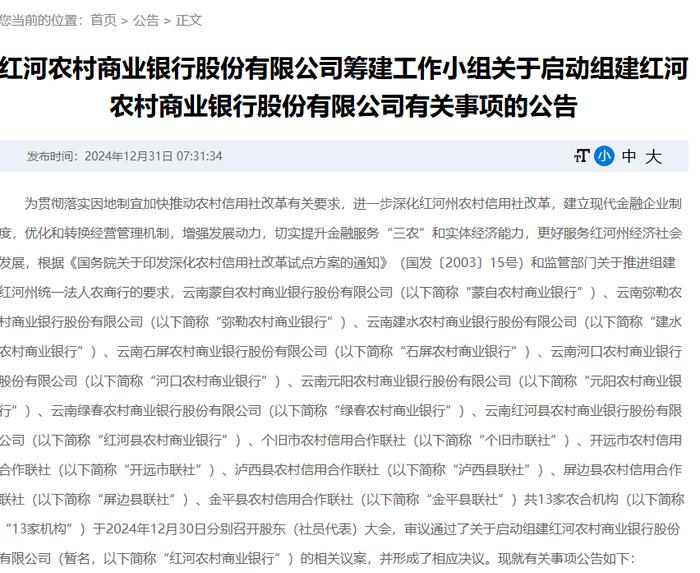 12月31日,红河农商银行在媒体发布筹建工作小组关于启动组建红河农村商业银行股份有限公司有关事项的公告显示,当地13家农合机构决定以新设合并方式组建红河农村商业银行。