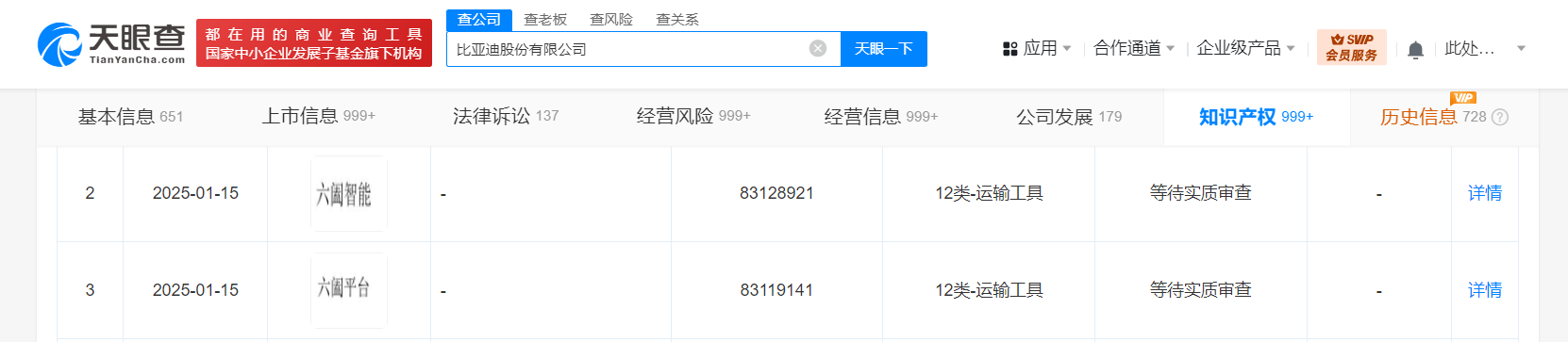 天眼查知识产权信息显示,近日,比亚迪股份有限公司申请注册“六阖智能”“六阖平台”商标,国际分类为运输工具,当前商标状态均为等待实质审查。