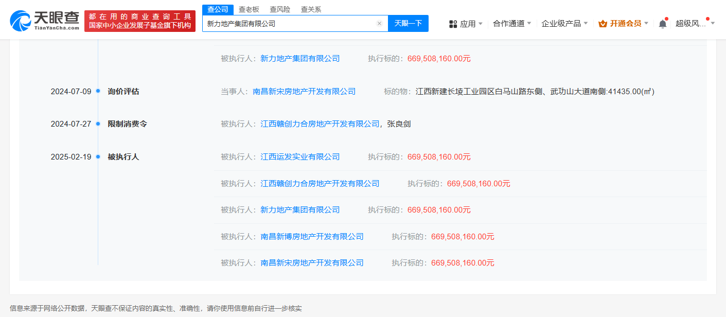 天眼查法律诉讼信息显示,近日,新力地产集团有限公司、江西赣创力合房地产开发有限公司、南昌新博房地产开发有限公司等新增1条恢复执行信息,执行标的6.69亿余元,执行法院为北京金融法院。