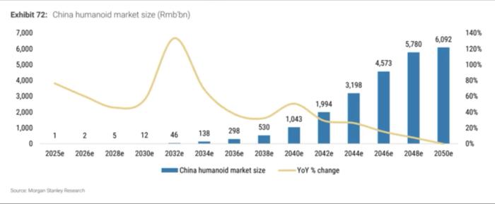 根据大摩的研究数据认为,中国人形机器人市场到2030年才会迎来真正意义上的大幅增长,并突破百亿市场规模,到2034年会突破千亿元市场规模。