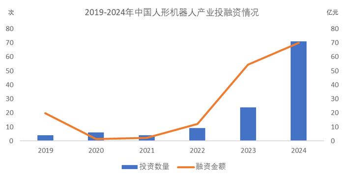 根据弘博报告网和圆周机器人的统计数据显示,自2022年起,中国人形机器人产业的投融资数量和规模节节攀升。截至2024年,已发生投资数量71起,披露融资金额约70亿元。显示出资本对行业未来发展前景的强烈信心。