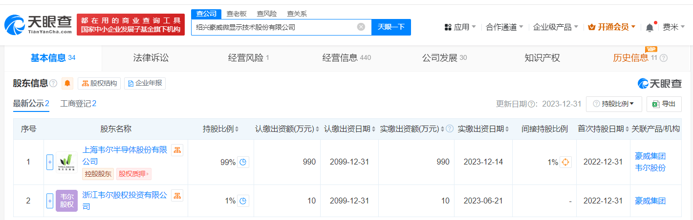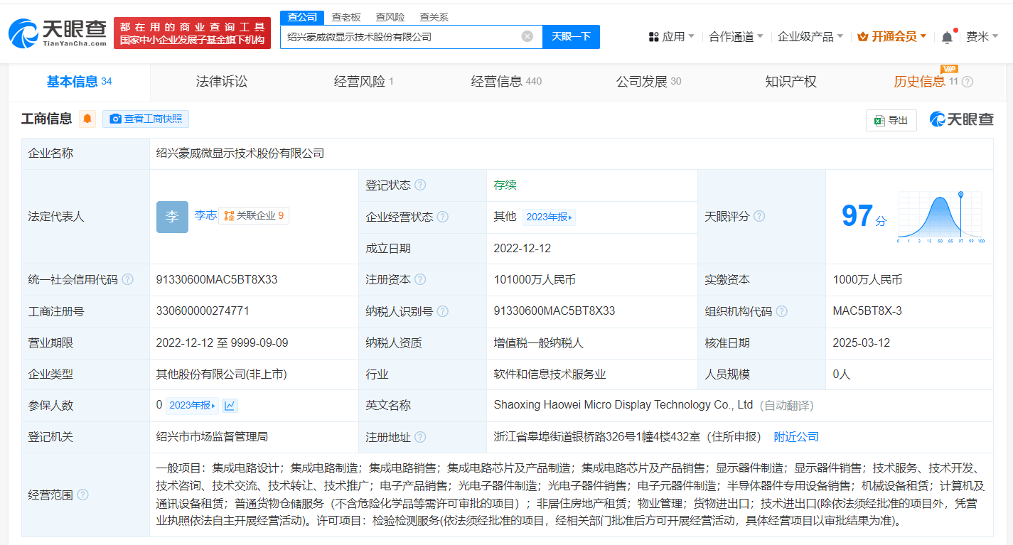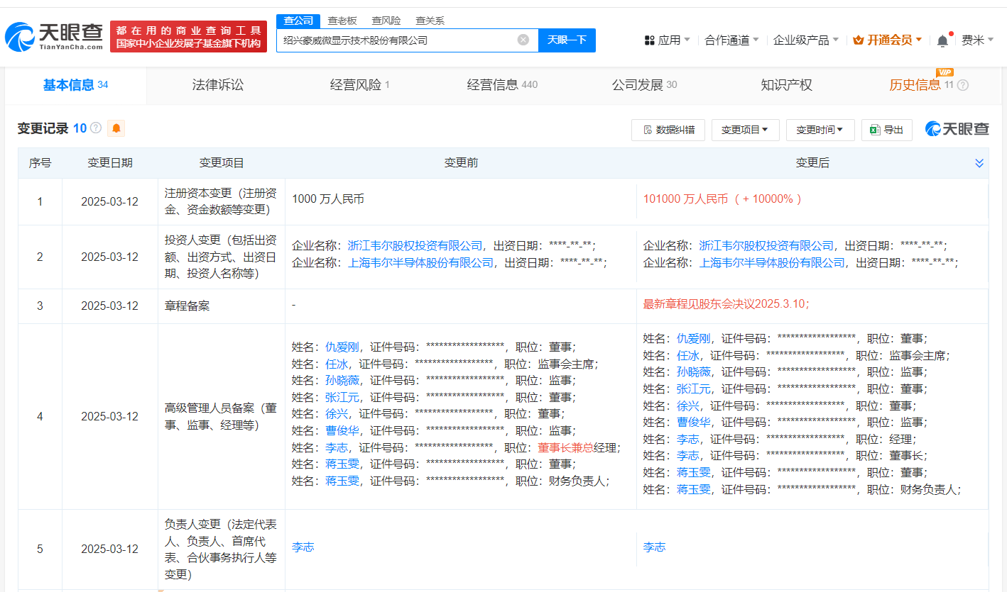 天眼查App显示,近日,绍兴豪威微显示技术股份有限公司发生工商变更,注册资本由1000万人民币增至10.1亿人民币,增幅10000%。