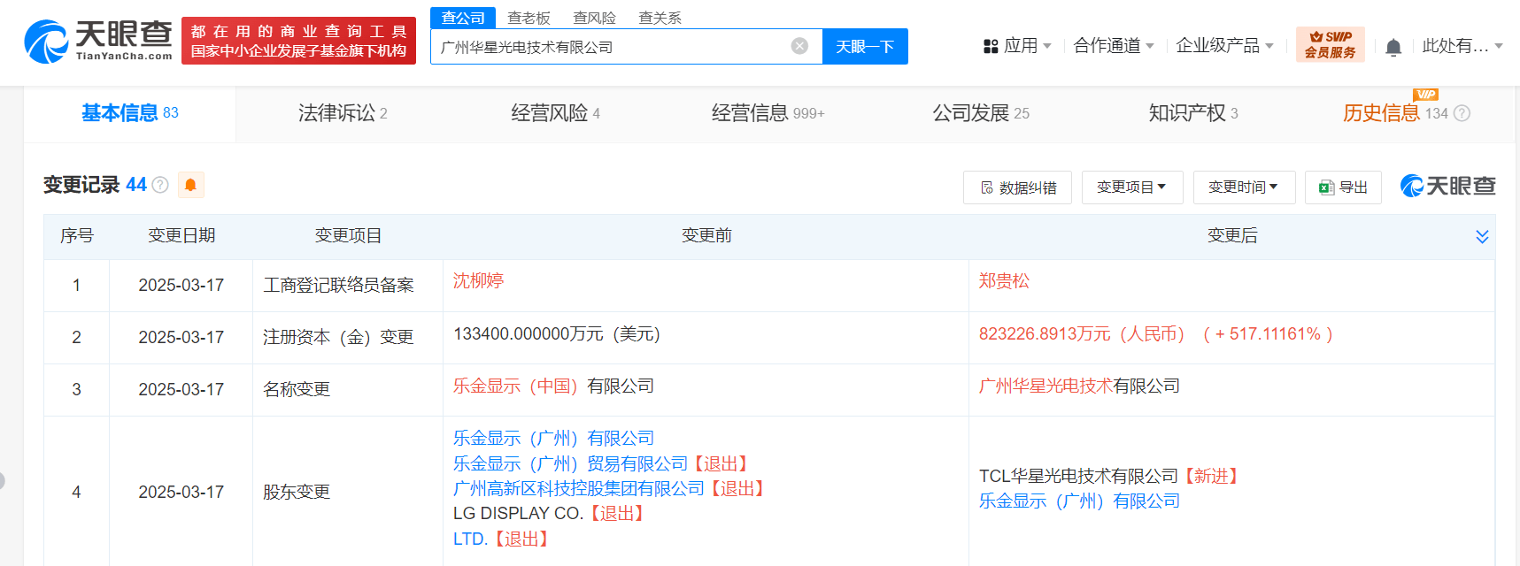 天眼查App显示,近日,乐金显示(中国)有限公司发生工商变更,企业名称变更为广州华星光电技术有限公司,乐金显示(广州)贸易有限公司、广州高新区科技控股集团有限公司、LG DISPLAY CO.,LTD.退出股东行列,新增TCL华星光电技术有限公司为股东,同时,注册资本由13.34亿美元变更为约82.32亿人民币。