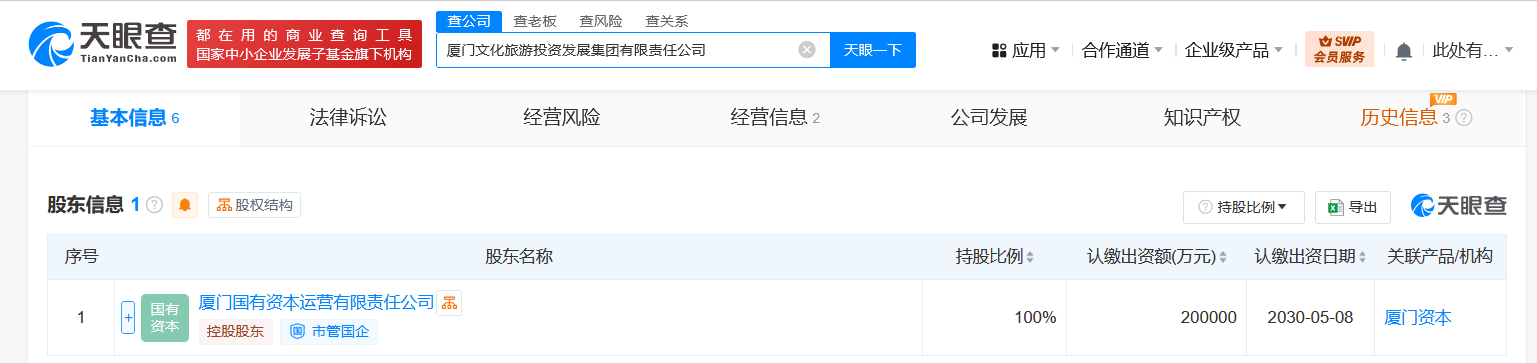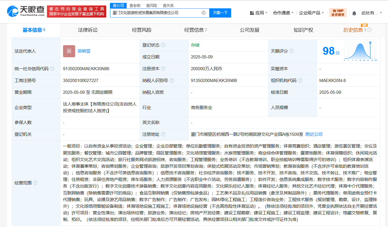 天眼查App显示,近日,厦门文化旅游投资发展集团有限责任公司成立,法定代表人为吴明显,注册资本20亿人民币,经营范围含以自有资金从事投资活动、企业管理、企业总部管理、自有资金投资的资产管理服务、体育竞赛组织、组织文化艺术交流活动等。股东信息显示,该公司由厦门国有资本运营有限责任公司全资持股。