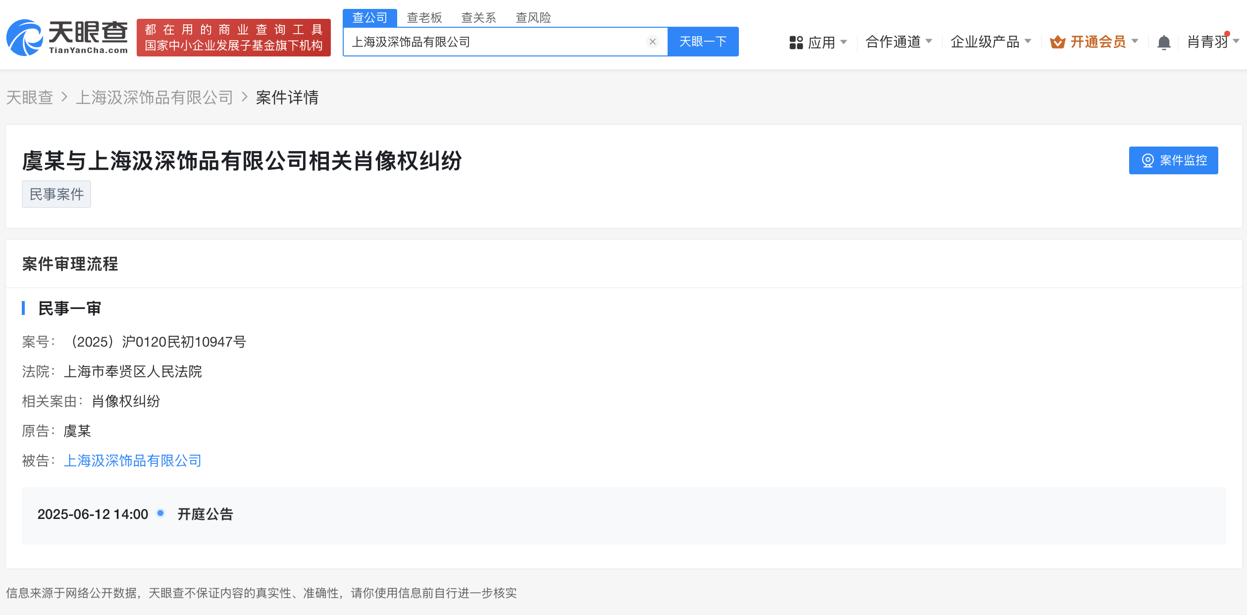天眼查App显示,近日,法院公开虞书欣与上海汲深饰品有限公司肖像权纠纷开庭公告,将于6月12日开庭。此外,虞书欣与侯某某名誉权纠纷新增开庭信息,将于7月1日开庭。