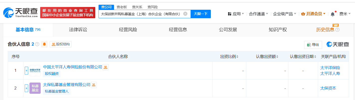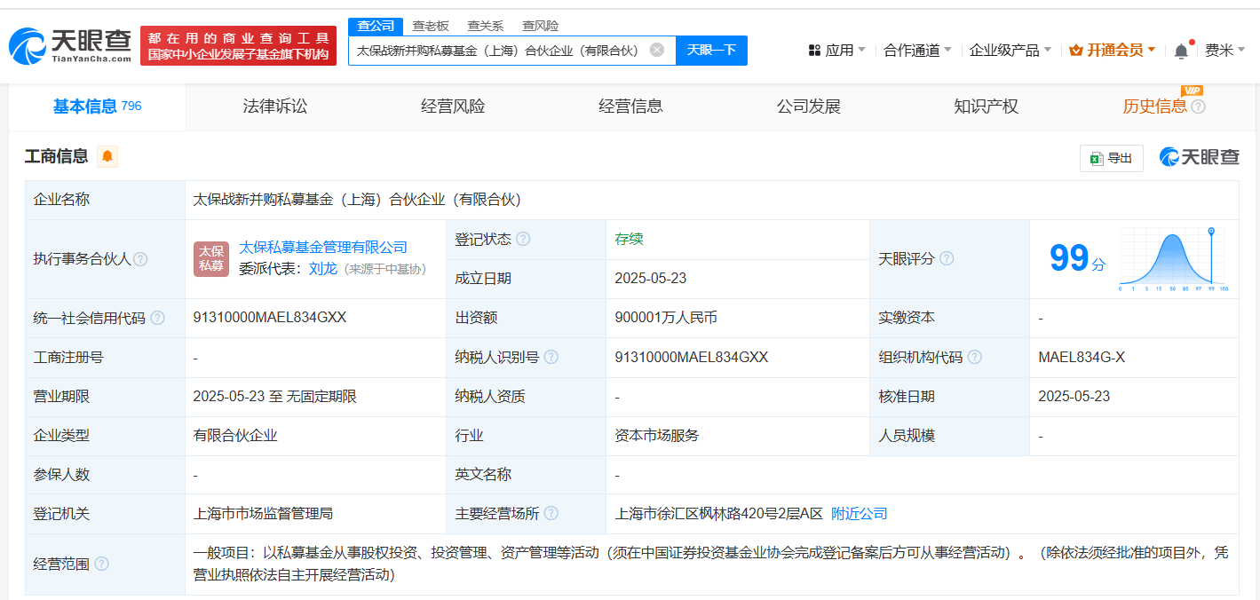 天眼查App显示,近日,太保战新并购私募基金(上海)合伙企业(有限合伙)成立,执行事务合伙人为太保私募基金管理有限公司,出资额约90亿人民币,经营范围为以私募基金从事股权投资、投资管理、资产管理等活动,由中国太平洋人寿保险股份有限公司、太保私募基金管理有限公司共同出资。
