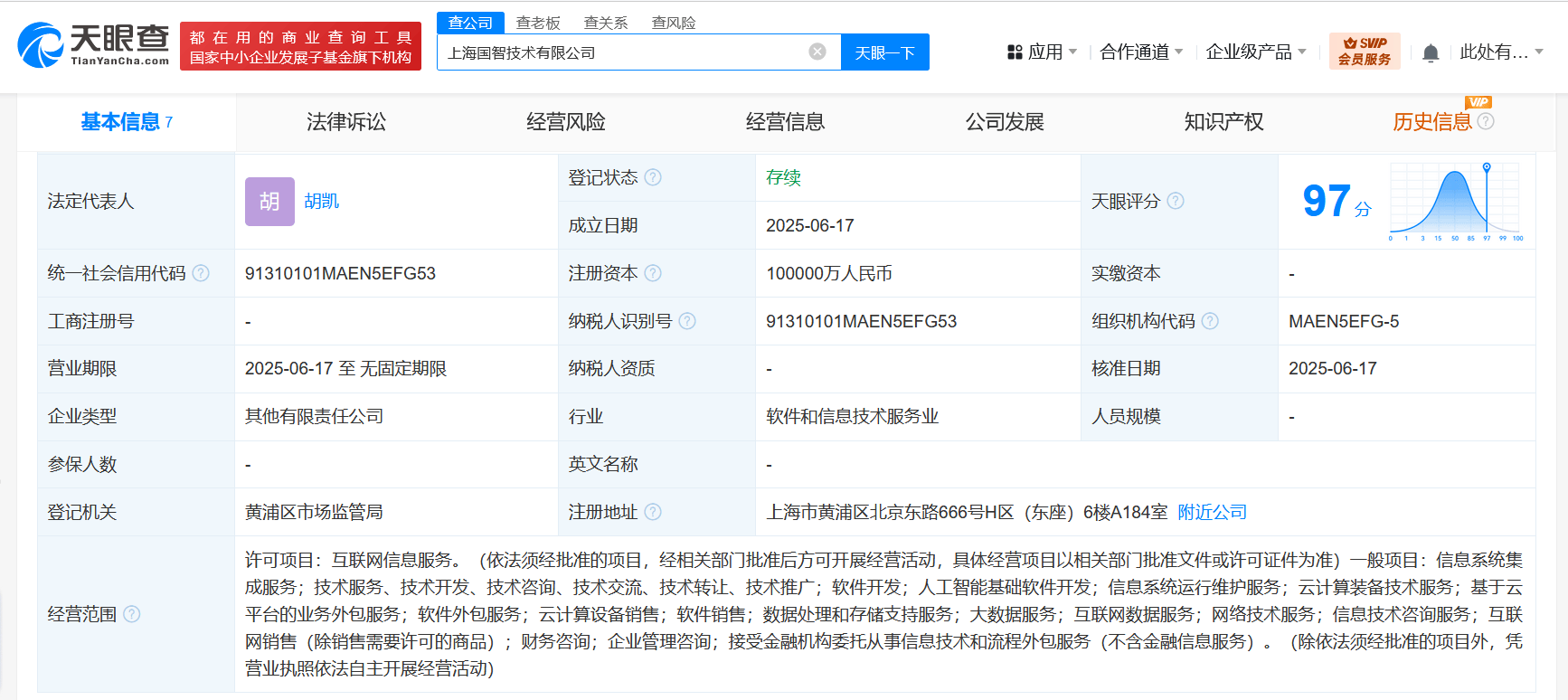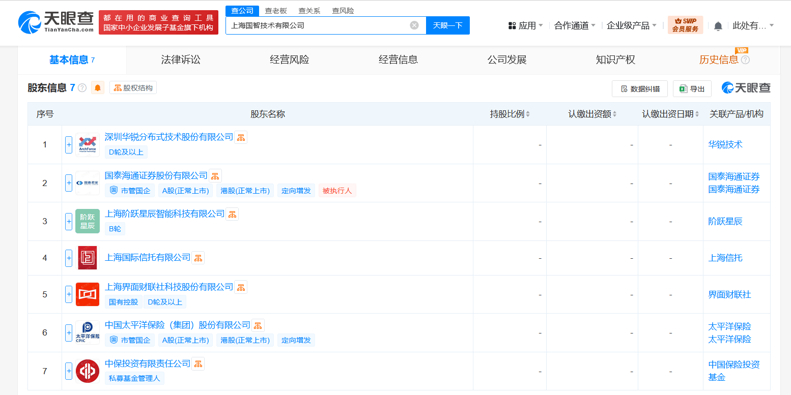 天眼查App显示,近日,上海国智技术有限公司成立,法定代表人为胡凯,注册资本10亿人民币,经营范围含互联网信息服务、信息系统集成服务、人工智能基础软件开发、信息系统运行维护服务、云计算装备技术服务、基于云平台的业务外包服务、软件外包服务、互联网数据服务等,由深圳华锐分布式技术股份有限公司、国泰海通(601211)、中国太保(601601)等共同持股。
