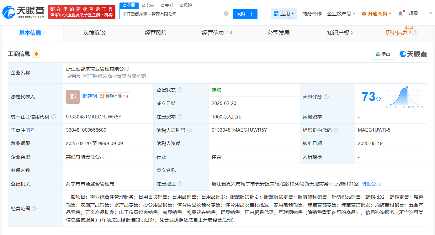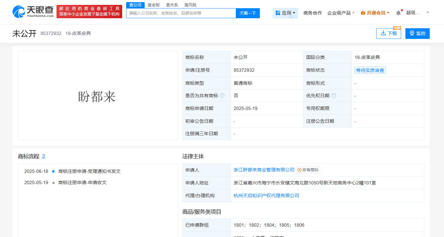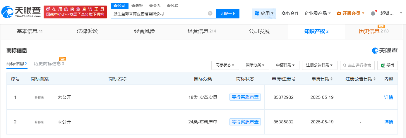 天眼查App显示,近日,浙江盈都来商业管理有限公司(曾用名:浙江胖都来商业管理有限公司)申请注册两枚“盼都来”商标,国际分类涉及布料床单、皮革皮具,当前商标状态均为等待实质审查。
