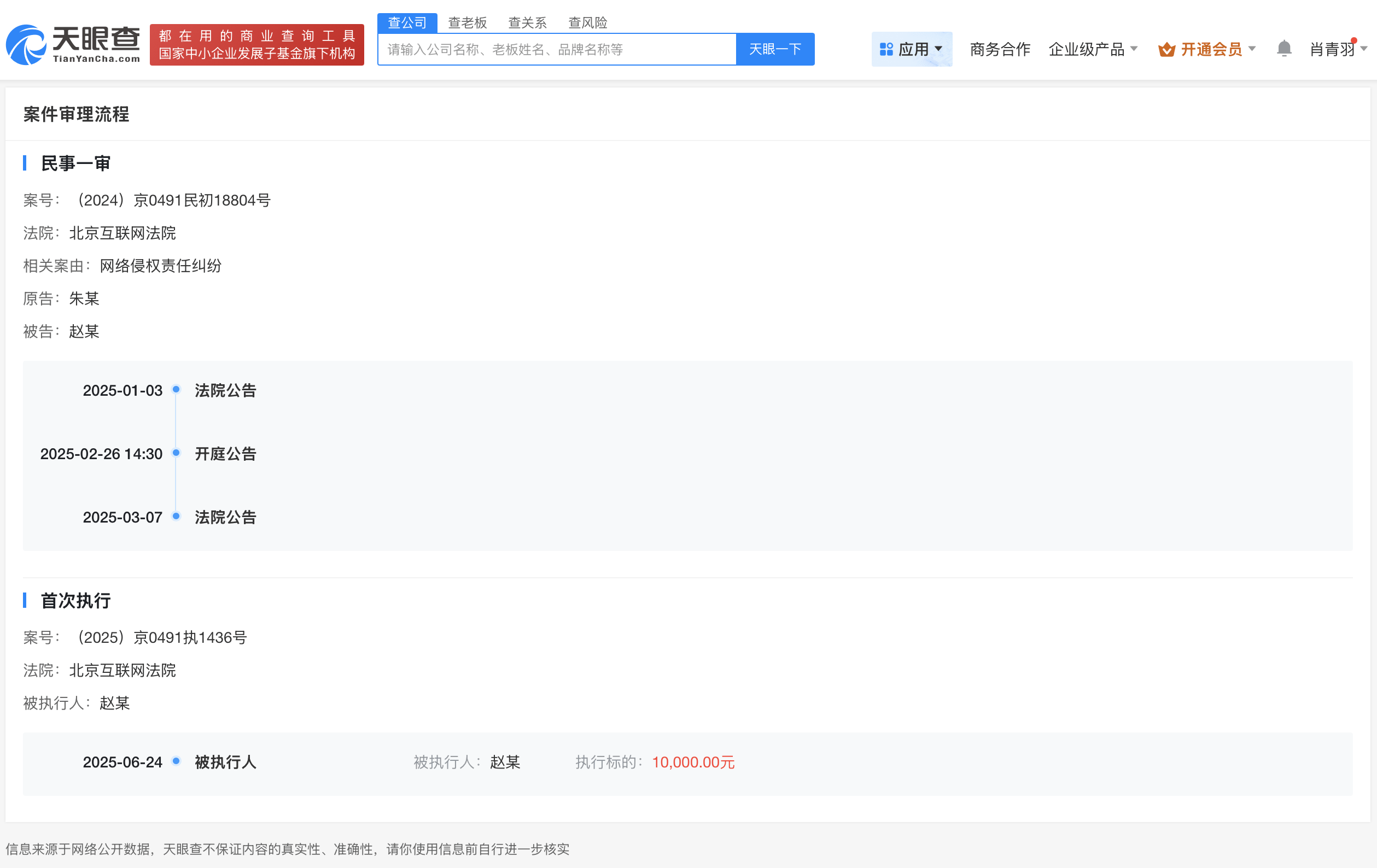 天眼查法律诉讼信息显示,近日,赵某某新增一则被执行人信息,执行标的1万元,涉及朱一龙与其网络侵权责任纠纷一案,执行法院为北京互联网法院。