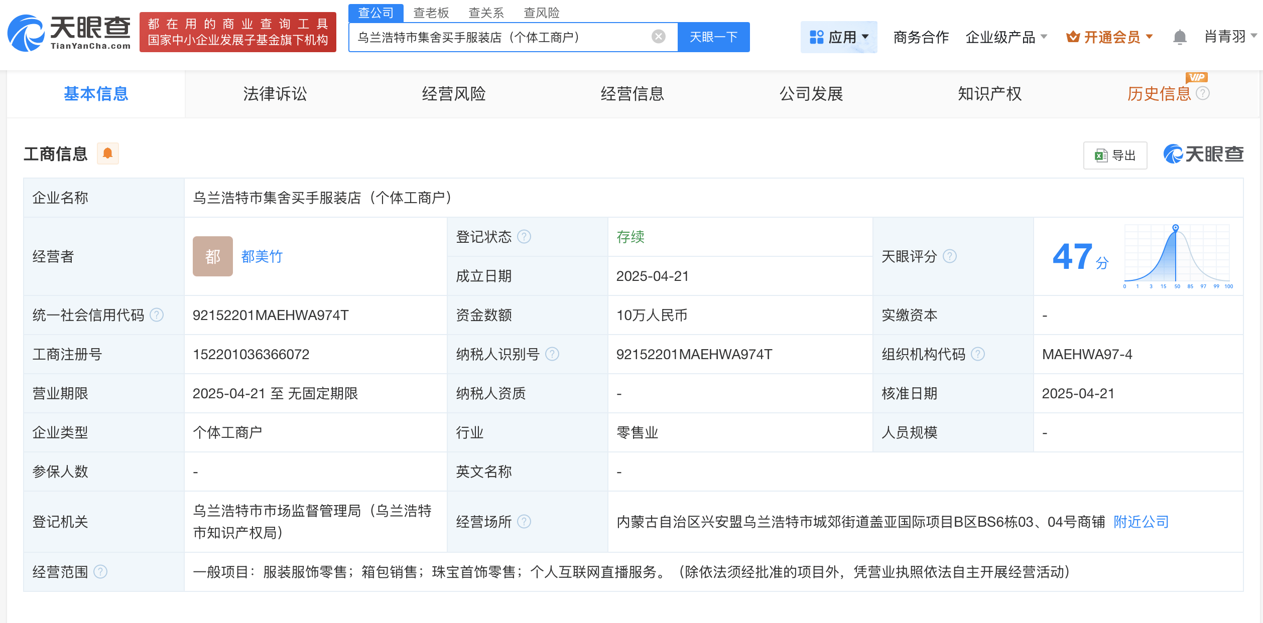 此外,值得注意的是,今年4月,都美竹成立乌兰浩特市集舍买手服装店(个体工商户),资金数额为10万人民币,经营范围包含服装服饰零售、箱包销售、珠宝首饰零售、个人互联网直播服务。据“都美竹”账号显示,该企业关联“IN BLOSSOM”品牌,都美竹为其品牌主理人,该品牌门店已于6月开业。