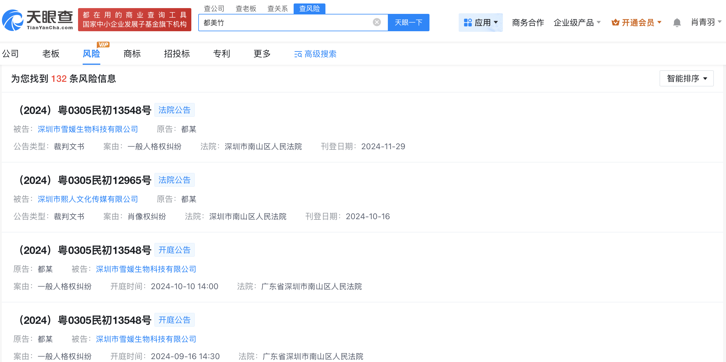 天眼查App显示,都美竹关联近百条开庭公告信息,原告均为都美竹,案由多为肖像权纠纷、网络侵权责任纠纷、人格权纠纷等,相关被告包括传媒公司、网络公司、科技公司等。已公开的法律诉讼文书显示,都美竹发起的维权诉讼多以撤诉结案。