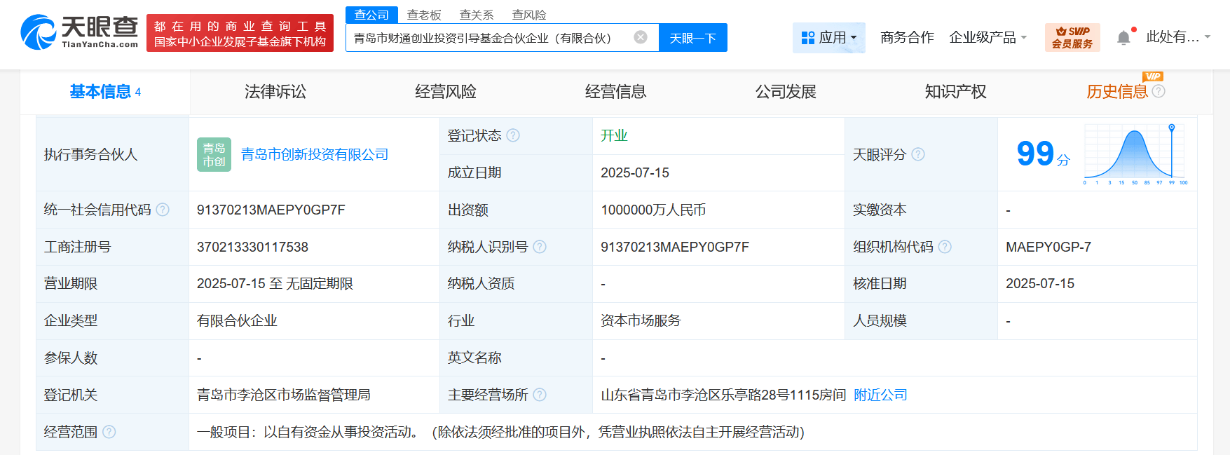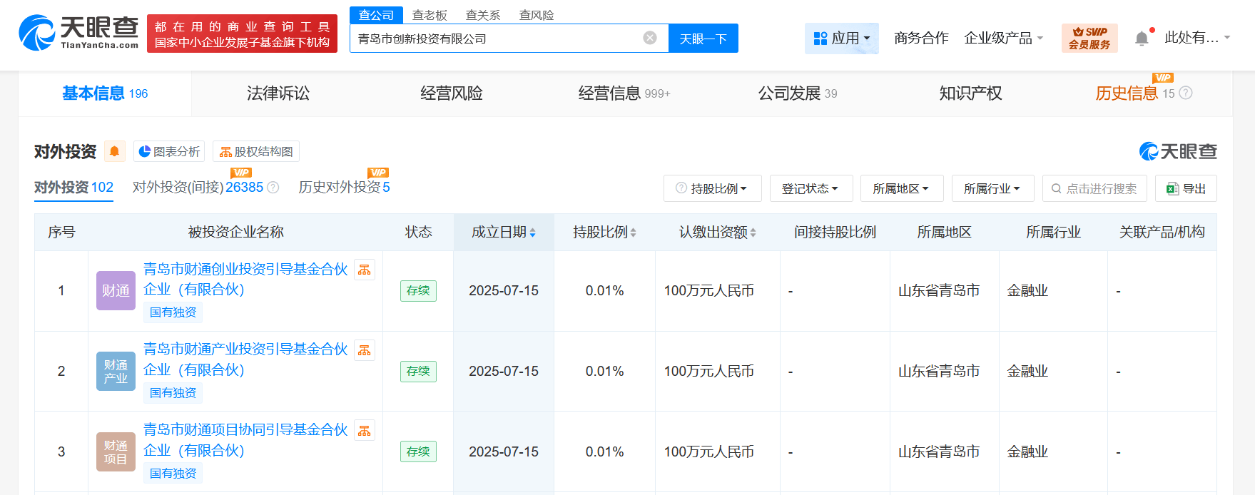 天眼查App显示,近日,青岛市财通创业投资引导基金合伙企业(有限合伙)、青岛市财通项目协同引导基金合伙企业(有限合伙)、青岛市财通产业投资引导基金合伙企业(有限合伙)成立,执行事务合伙人均为青岛市创新投资有限公司,注册资本均为100亿人民币,经营范围均为以自有资金从事投资活动。合伙人信息显示,上述3只基金均由青岛财通集团旗下青岛市引导基金投资有限公司、青岛市创新投资有限公司共同出资。