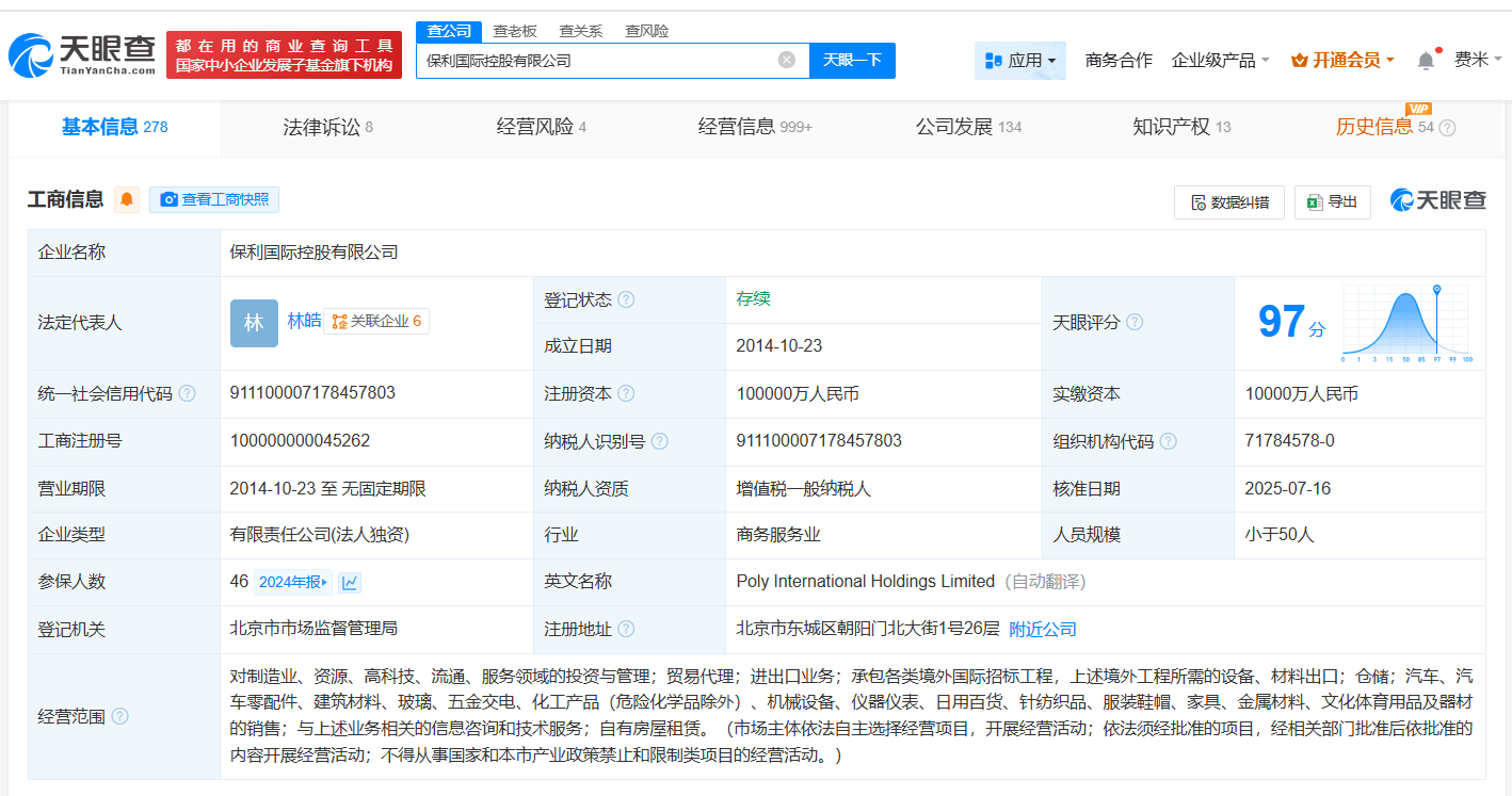 该公司成立于2014年10月,法定代表人为林皓,经营范围包括贸易代理、进出口业务、自有房屋租赁等,由中国保利集团有限公司全资持股。
