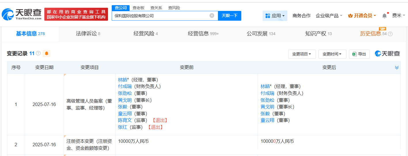 天眼查App显示,近日,保利国际控股有限公司发生工商变更,注册资本由1亿人民币增至10亿人民币,增幅900%,同时部分高管发生变更。