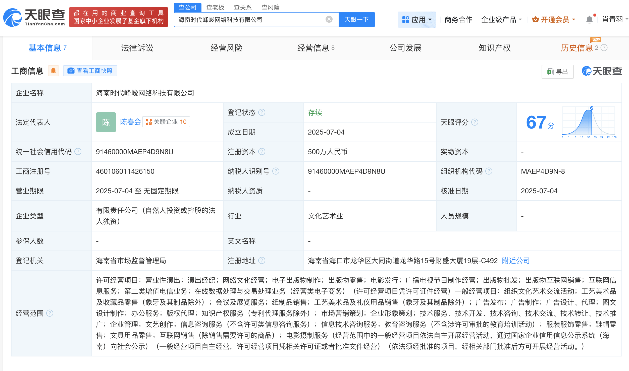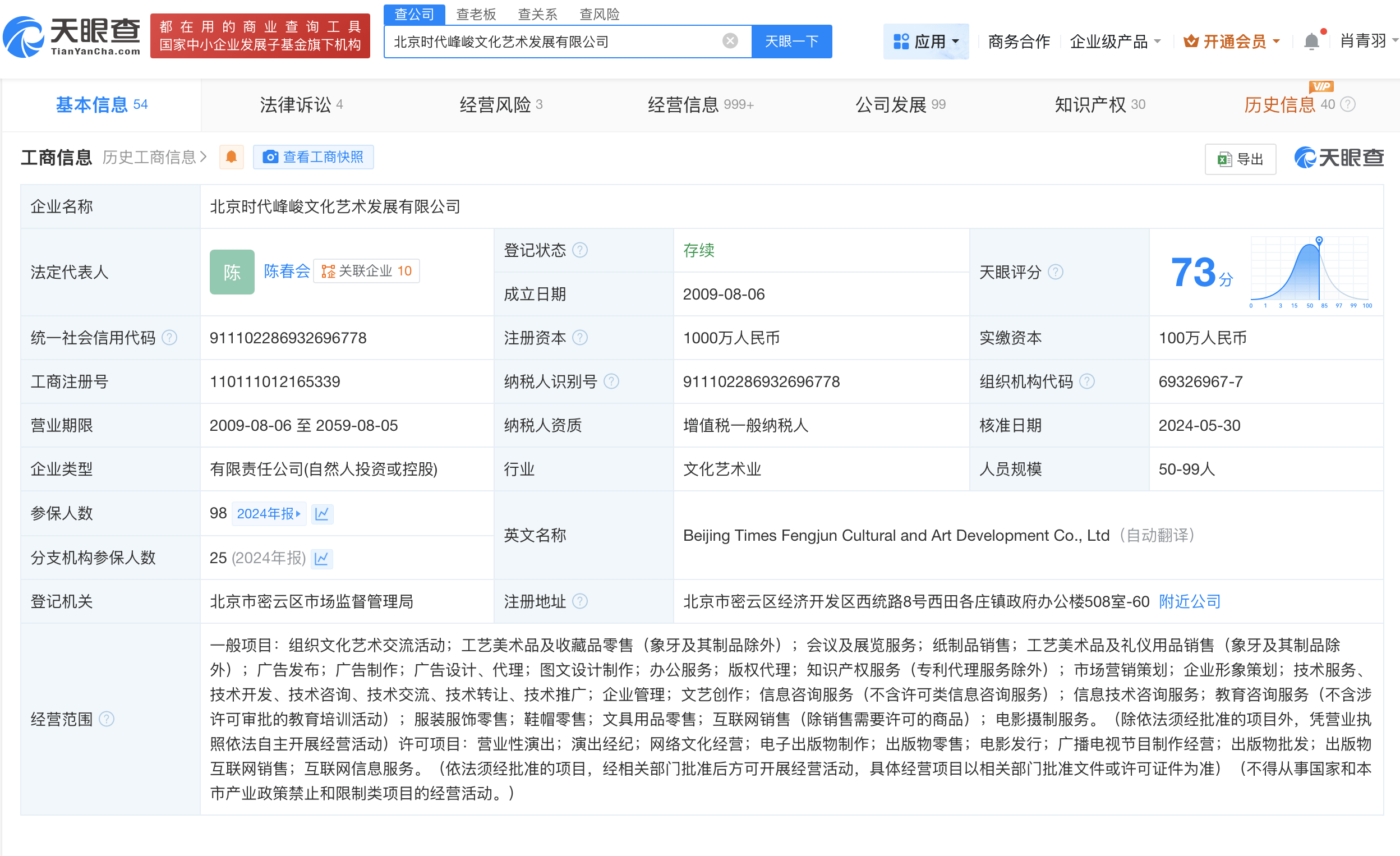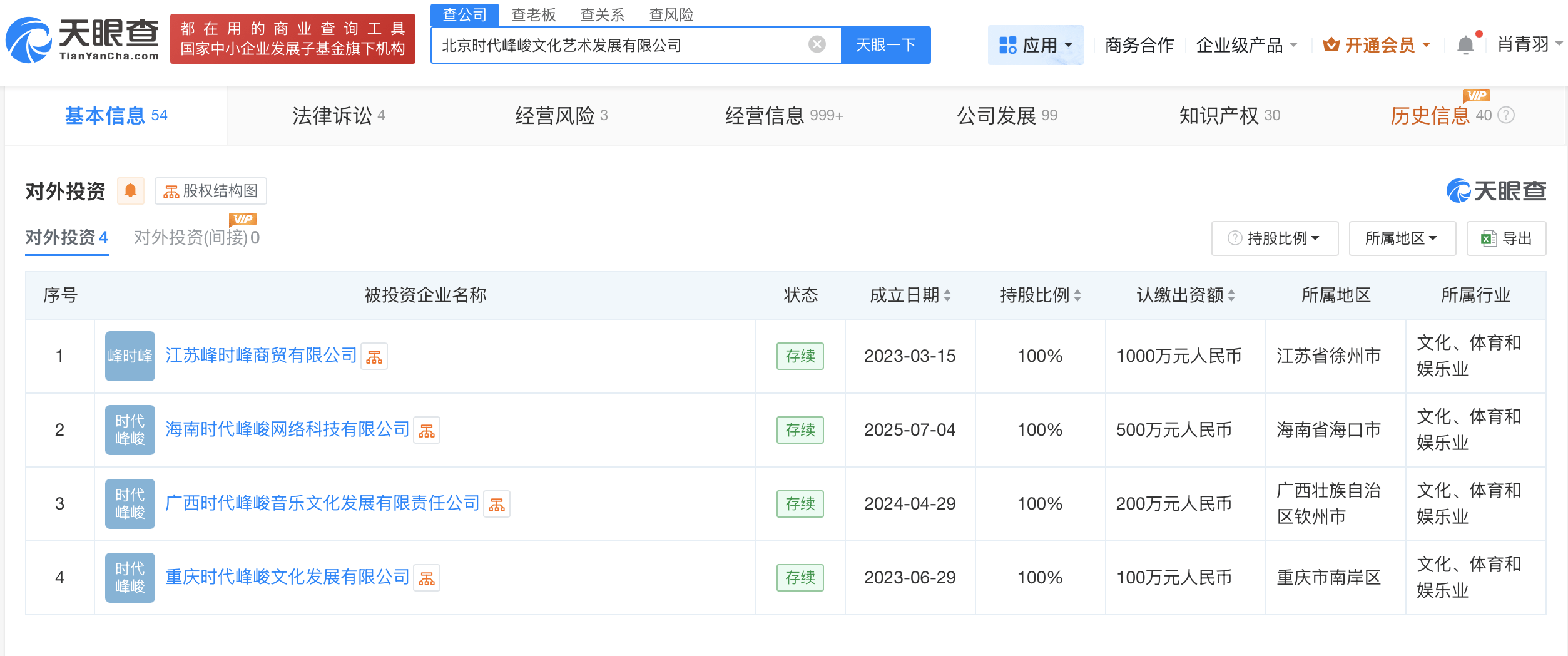天眼查App显示,近日,北京时代峰峻文化艺术发展有限公司在海南成立海南时代峰峻网络科技有限公司,法定代表人为陈春会,注册资本500万人民币,经营范围包括营业性演出、演出经纪、网络文化经营、电子出版物制作、出版物零售等。对外投资信息显示,该公司持有多家企业股份,包括江苏峰时峰商贸有限公司、广西时代峰峻音乐文化发展有限责任公司等。