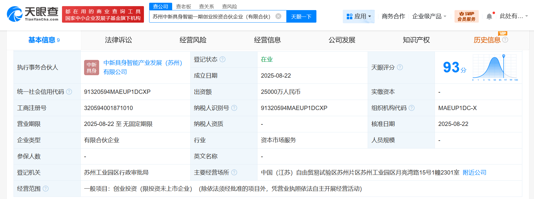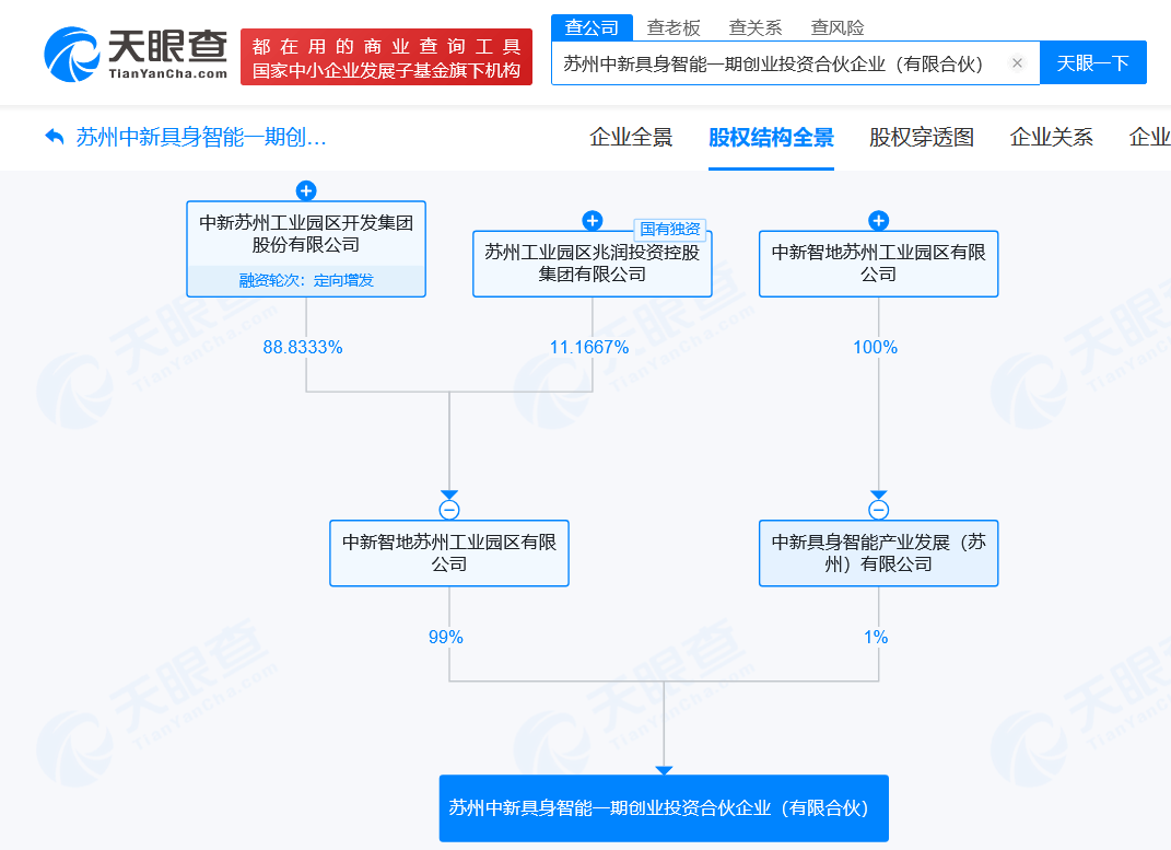 天眼查工商信息显示,近日,苏州中新具身智能一期创业投资合伙企业(有限合伙)成立,执行事务合伙人为中新具身智能产业发展(苏州)有限公司,出资额2.5亿人民币,经营范围为创业投资。股权全景穿透图显示,该企业由中新集团(601512)旗下中新智地苏州工业园区有限公司、中新具身智能产业发展(苏州)有限公司共同出资。