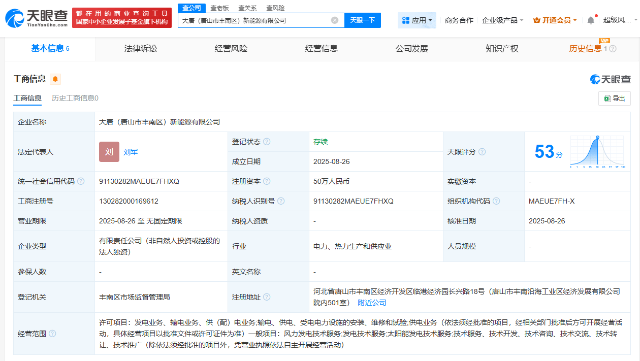 天眼查App显示,近日,大唐(唐山市丰南区)新能源有限公司成立,法定代表人为刘军,注册资本50万人民币,经营范围包括风力发电技术服务、发电技术服务、太阳能发电技术服务等。股东信息显示,该公司由大唐发电(601991)全资持股。