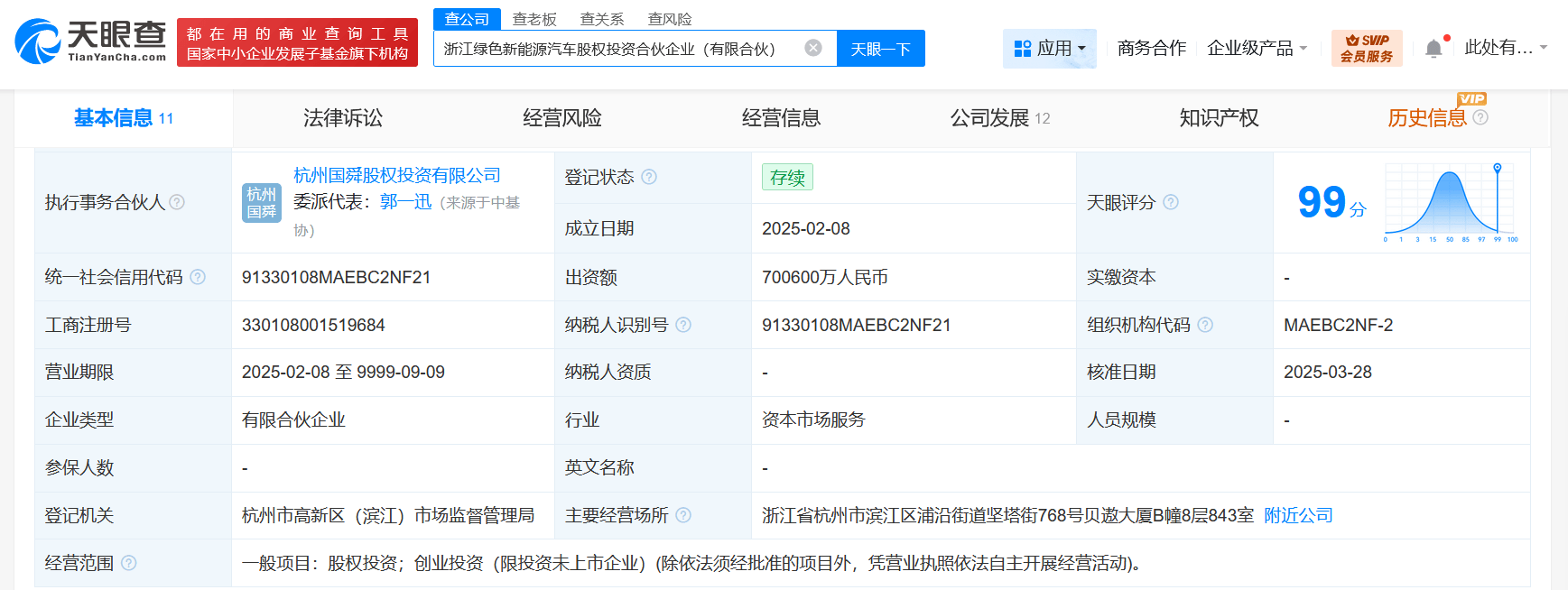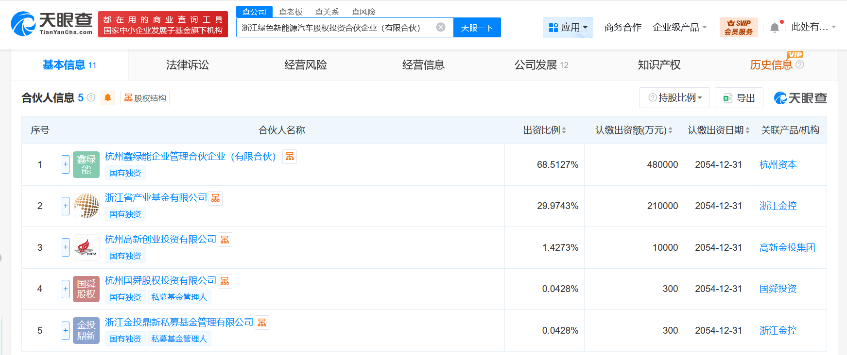 天眼查工商信息显示,近日,杭州中金雷诺安培融盛创业投资合伙企业(有限合伙)成立,执行事务合伙人为中金私募股权投资管理有限公司,出资额10亿人民币,经营范围为股权投资、创业投资。合伙人信息显示,该企业由杭州高新创业投资有限公司、中金公司(601995)旗下中金私募股权投资管理有限公司、义乌中金宏盛股权投资基金合伙企业(有限合伙)、浙江绿色新能源汽车股权投资合伙企业(有限合伙)等共同出资。