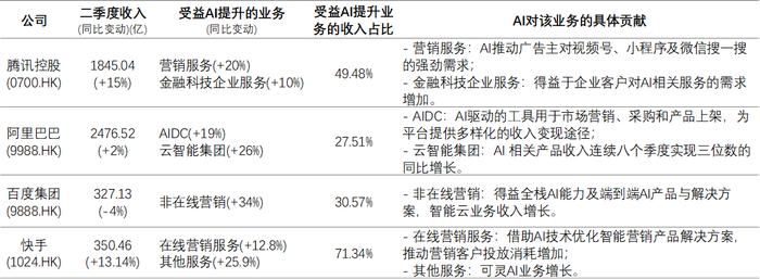 而在刚刚结束的中期业绩披露季中,国内的多家头部互联网科技企业也直接披露了AI对公司业绩的提升的重要作用。除了AI智能设备及智驾汽车等硬件制造业务的提升外,不少企业已通过搭载AI大模型和应用产品矩阵,推动了云服务、智能营销等多元板块业务也获得了显著增长。
