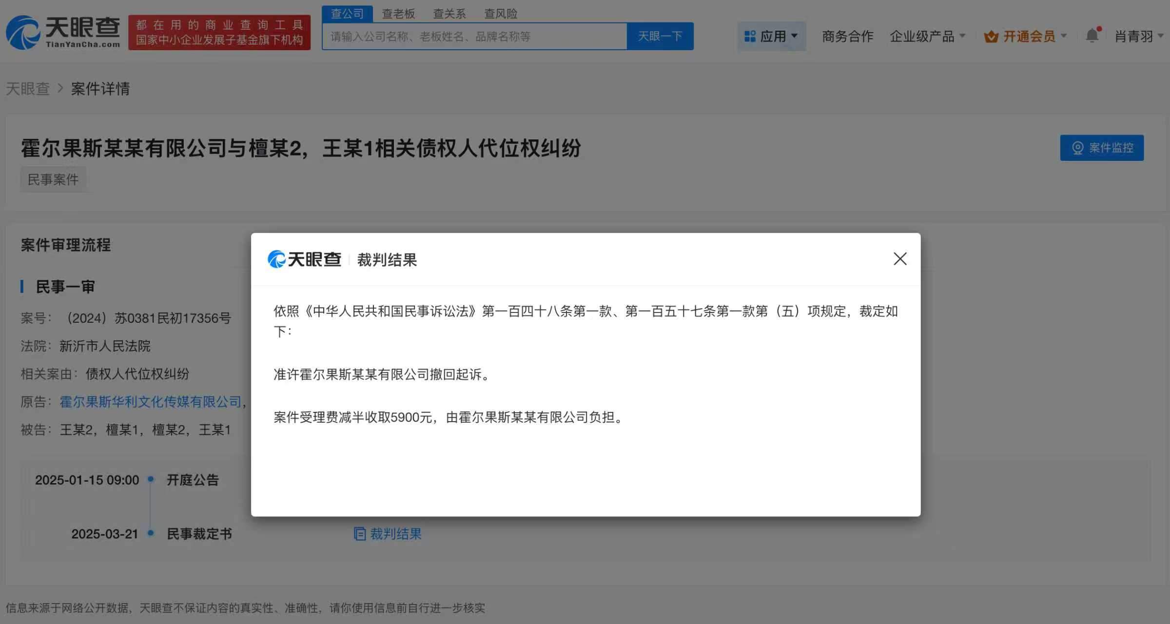 天眼查App显示,近日,霍尔果斯华利文化传媒有限公司与檀健次等债权人代位权纠纷裁判文书公布。文书信息显示,原告自愿提出撤诉申请,符合法律规定,应予准许。