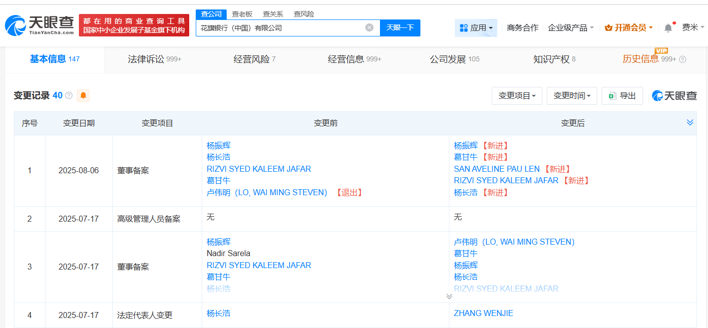 天眼查工商信息显示,花旗中国关联公司花旗银行(中国)有限公司成立于2007年3月,注册资本39.7亿人民币,经营范围为银行业务、证券投资基金托管、公募证券投资基金销售。股东信息显示,该公司由美国花旗银行有限公司全资持股。分支机构信息显示,该公司的56家分支机构中,仅14家处于存续或开业状态,其余42家分支机构已被注销或吊销。变更记录信息显示,今年8月,卢伟明(LO, WAI MING STEVEN)卸任董事长,由SAN AVELINE PAU LEN接任;今年7月,杨长浩卸任法定代表人,由ZHANG WENJIE接任。