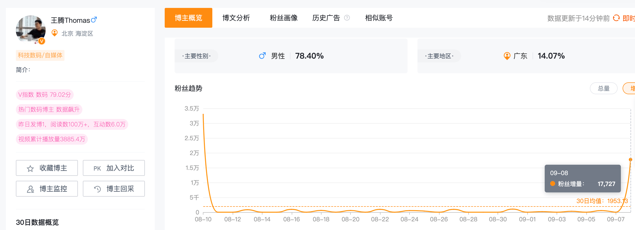 9月8日晚,小米内部通报,原小米中国区市场部总经理、REDMI品牌总经理王腾因泄密被辞退。查询某视频平台发现,“王腾Thomas”账号已设置成私密状态。第三方数据显示,“王腾Thomas”短视频平台账号近30日涨粉16.97万。该账号1-20s视频预估报价为2.64万,21-60s视频预估报价为2.7万,60s+视频预估报价为3.85万。此外,“王腾Thomas”某社交平台账号9月8日致歉当日涨粉超1.7万。