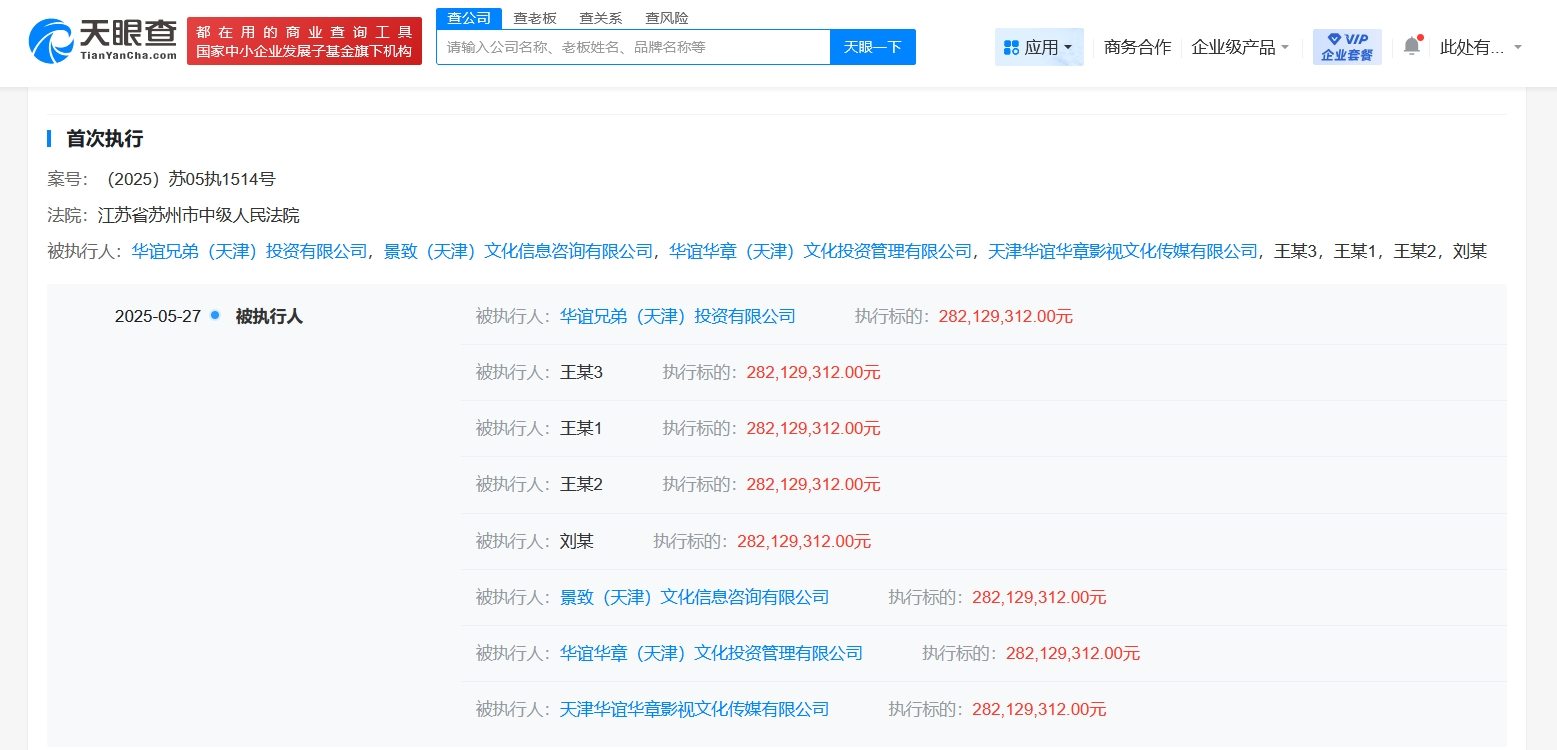 天眼查任职信息显示,王中磊(王忠磊)名下共关联70余家企业,其中近50家为存续状态,包括华谊兄弟传媒股份有限公司、北京华谊兄弟娱乐投资有限公司、华谊兄弟点睛动画影业有限公司、华谊兄弟影院投资有限公司等,王忠磊在上述企业担任执行董事、总经理等职务。天眼风险信息显示,今年5月,王忠磊、王忠军等因金融借款合同纠纷案件,被江苏省苏州市中级人民法院执行2.8亿余元。
