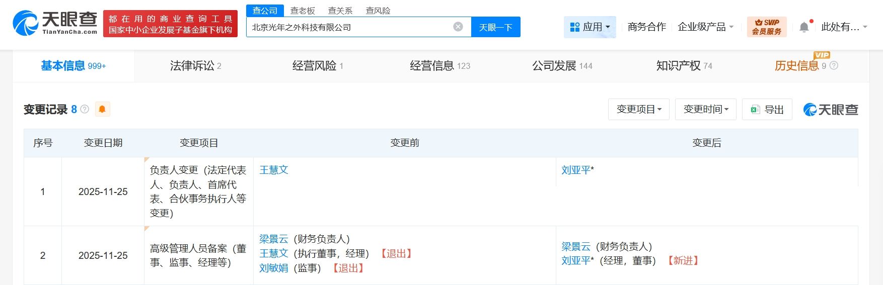 天眼查工商信息显示,近日,北京光年之外科技有限公司发生工商变更,王慧文卸任法定代表人、执行董事、经理,由刘亚平接任法定代表人、经理并担任董事,刘敏娟卸任监事。