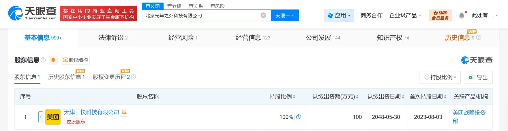 该公司成立于2018年7月,注册资本100万人民币,经营范围含技术服务、技术转让、技术开发、技术推广、技术咨询,销售自行开发的产品,计算机系统服务,产品设计。股东信息显示,该公司由美团旗下天津三快科技有限公司全资持股。