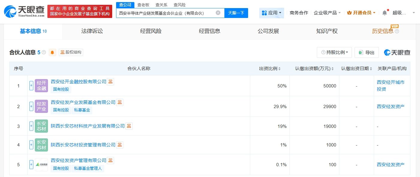 天眼查工商信息显示,近日,西安半导体产业链发展基金合伙企业(有限合伙)成立,执行事务合伙人为西安经发资产管理有限公司,出资额10亿人民币,经营范围包括创业投资,以私募基金从事股权投资、投资管理、资产管理等活动。合伙人信息显示,该基金由西安经开金融控股有限公司、西安经发产业发展基金有限公司、陕西长安芯材科技产业发展有限公司等共同出资。