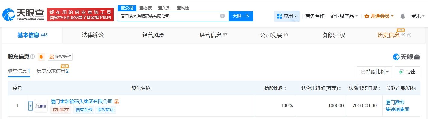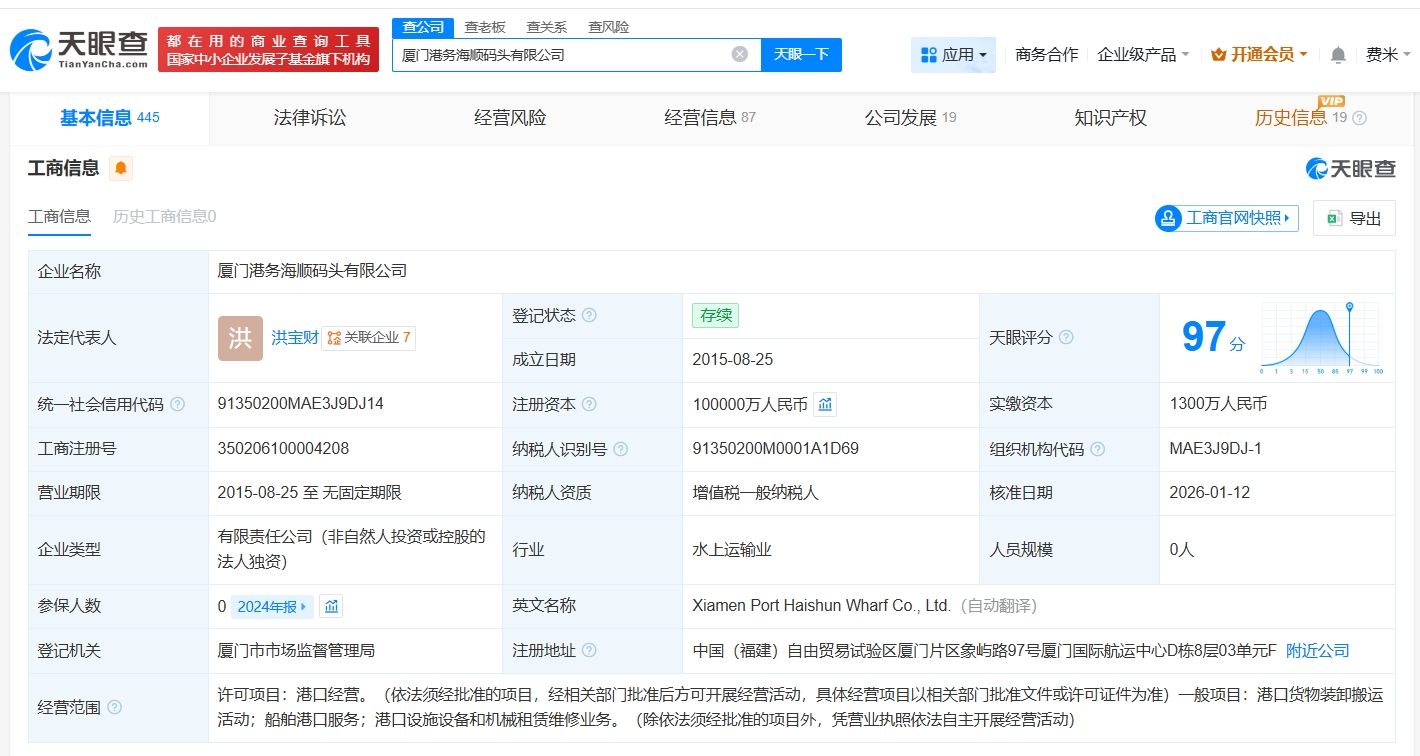 厦门港务海顺码头有限公司成立于2015年8月,法定代表人为洪宝财,经营范围为港口经营、港口货物装卸搬运活动、船舶港口服务、港口设施设备和机械租赁维修业务。股东信息显示,该公司由厦门集装箱码头集团有限公司全资持股。