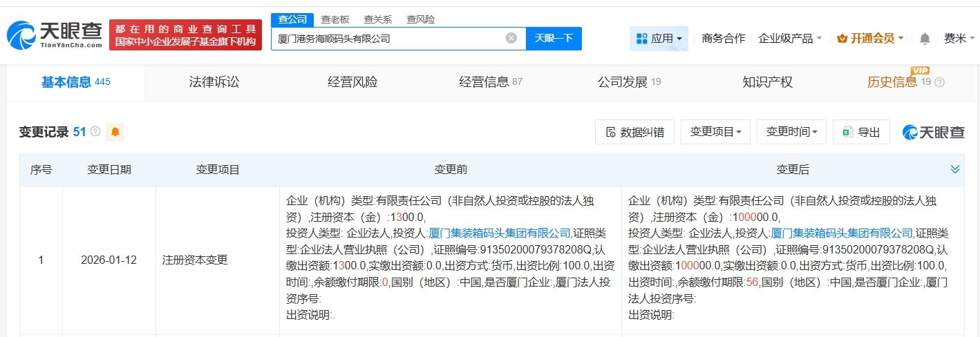 天眼查工商信息显示,近日,厦门港务海顺码头有限公司发生工商变更,注册资本由1300万人民币增至10亿人民币,增幅约7592%。