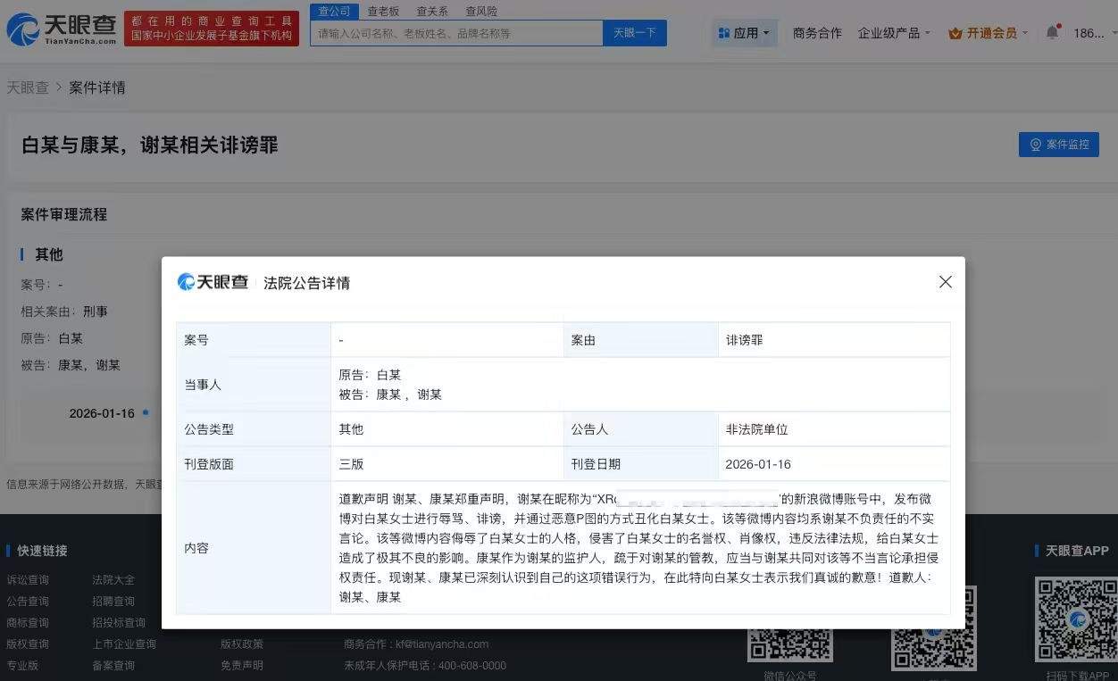 天眼查法律诉讼信息显示,近日,法院公开谢某、康某向白梦妍(白鹿)的致歉声明。内容显示,谢某发布微博对白梦妍女士进行辱骂、诽谤,并通过恶意P图的方式丑化白梦妍女士。该等微博内容均系谢某不负责任的不实言论。该等微博内容侮辱了白梦妍女士的人格,侵害了白梦妍女士的名誉权、肖像权,违反法律法规,给白梦妍女士造成了极其不良的影响。康某作为谢某的监护人,疏于对谢某的管教,应当与谢某共同对该等不当言论承担侵权责任。现谢某、康某已深刻认识到自己的这项错误行为,在此特向白梦妍女士表示歉意。