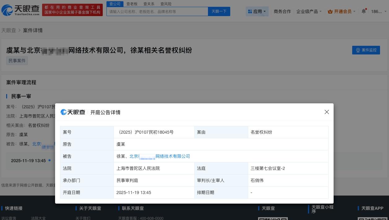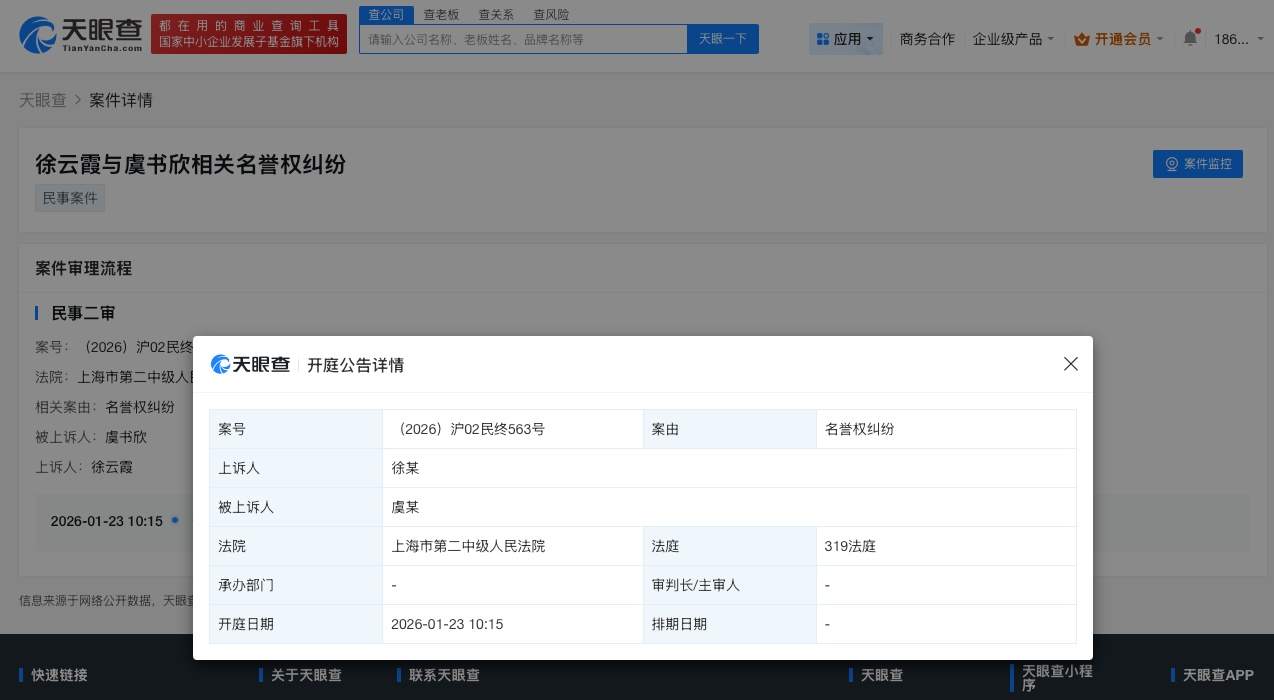 天眼查天眼风险信息显示,近日,徐某与虞书欣相关名誉权纠纷案件新增二审开庭公告,被上诉人为虞书欣,该案将于2026年1月23日在上海市第二中级人民法院开庭审理。此前,虞书欣曾因名誉权纠纷起诉徐某等。
