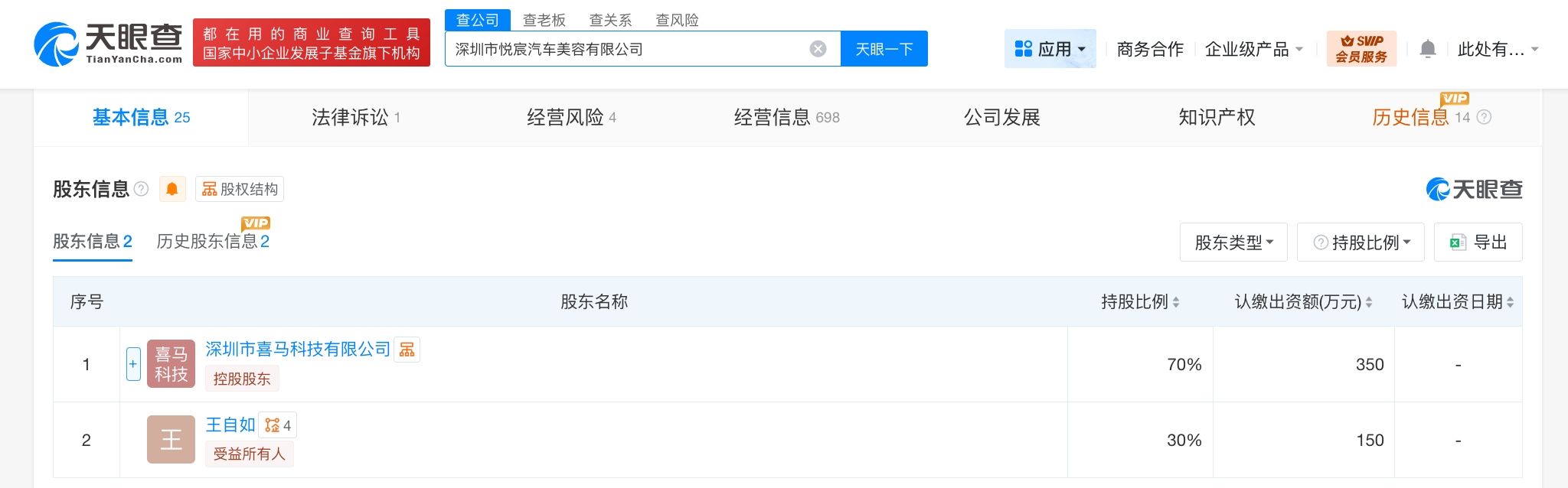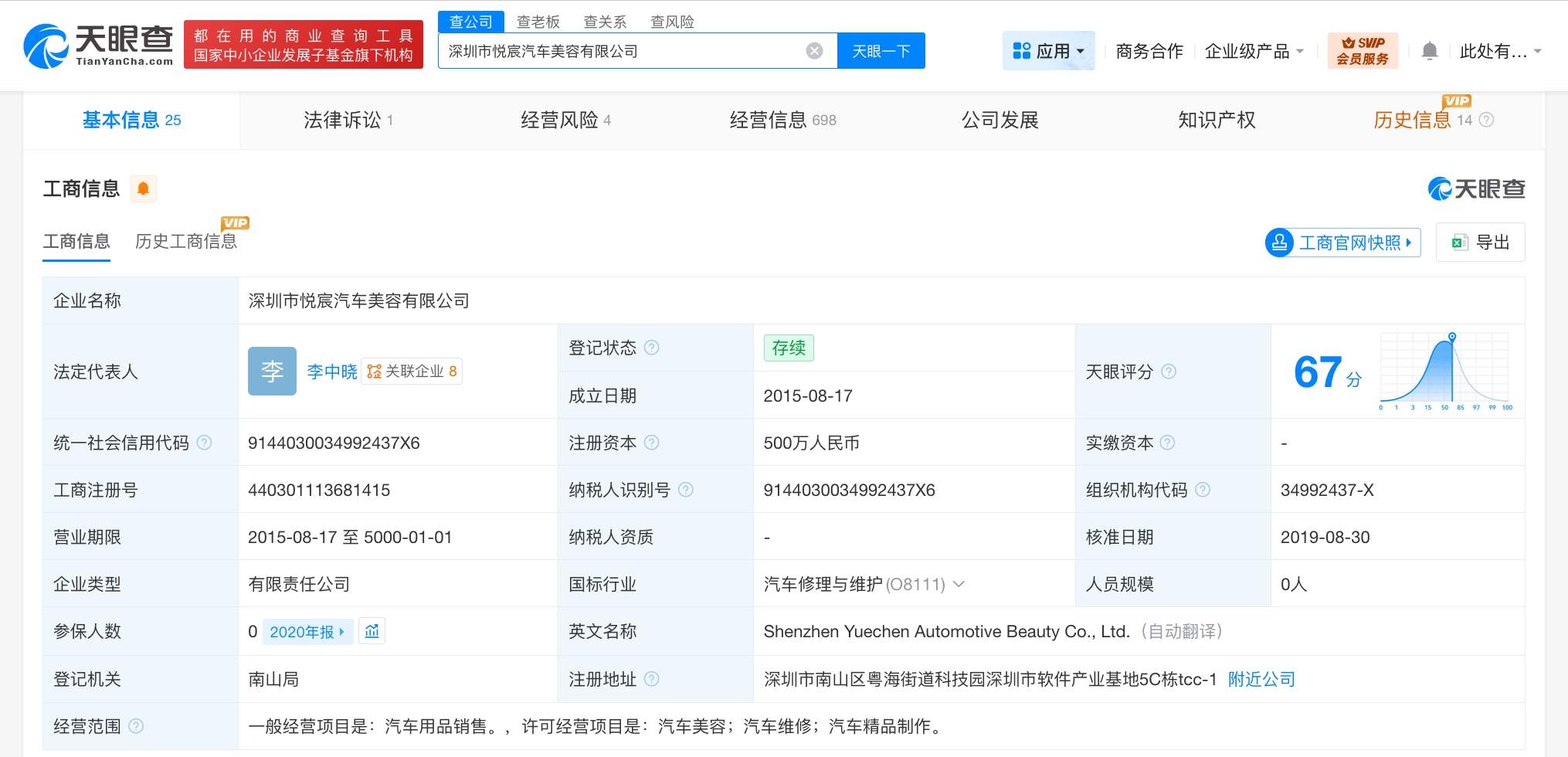 工商信息显示,深圳市悦宸汽车美容有限公司成立于2015年8月,法定代表人为李中晓,注册资本500万人民币,经营范围为汽车用品销售、汽车美容、汽车维修、汽车精品制作。股东信息显示,该公司由深圳市喜马科技有限公司、王自如分别持股70%、30%。