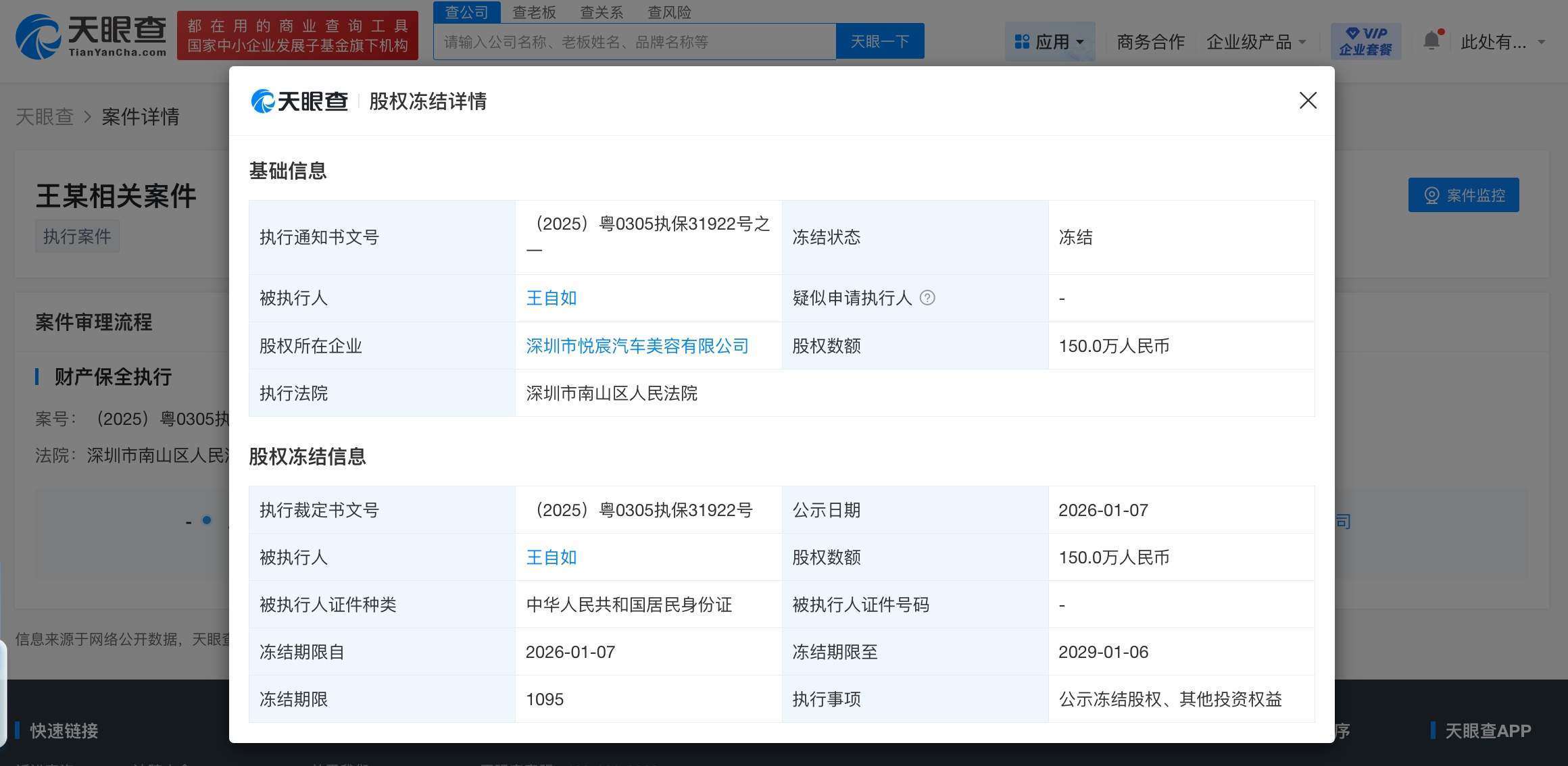 天眼查天眼风险信息显示,近日,王自如新增一则股权冻结信息,股权所在企业为深圳市悦宸汽车美容有限公司,冻结股权数额150万人民币,冻结期限3年,执行法院为广东省深圳市南山区人民法院。值得一提的是,2024年2月,王自如持有该公司的150万股权已被冻结。