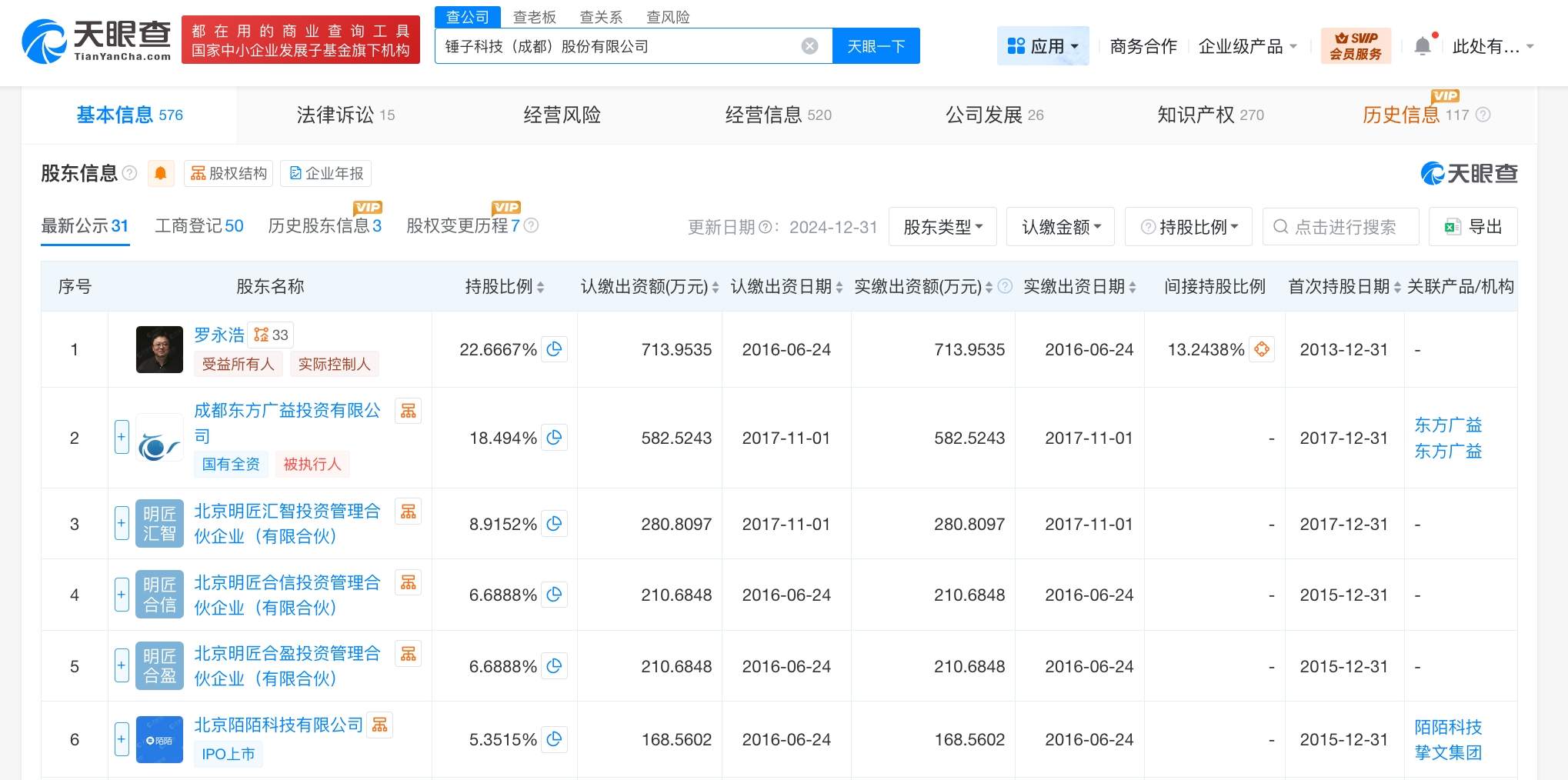 天眼查天眼风险信息显示,近日,罗永浩新增一则股权冻结信息,股权所在企业为锤子科技(成都)股份有限公司,冻结股权数额713万余元,冻结期限自2026年1月20日至2029年1月19日,执行法院为北京市丰台区人民法院。