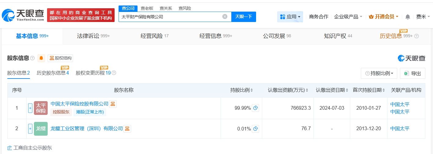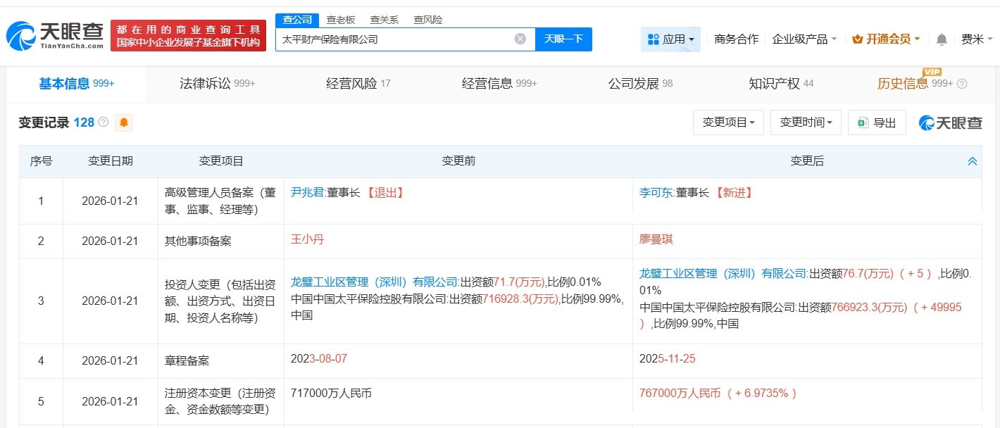 天眼查App显示,近日,太平财产保险有限公司发生工商变更,注册资本由71.7亿人民币增至76.7亿人民币,增幅约7%,同时,尹兆君卸任董事长,由李可东接任。