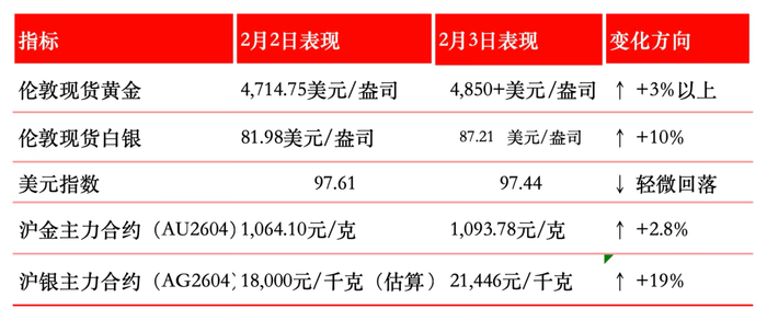 2026年2月3日,贵金属市场迎来显著反弹,现货黄金回升至4850美元/盎司上方,日内涨幅超4%;现货白银涨幅扩大至8%,沪银主力合约收于21,446元/千克,较前一交易日低点大幅修复。