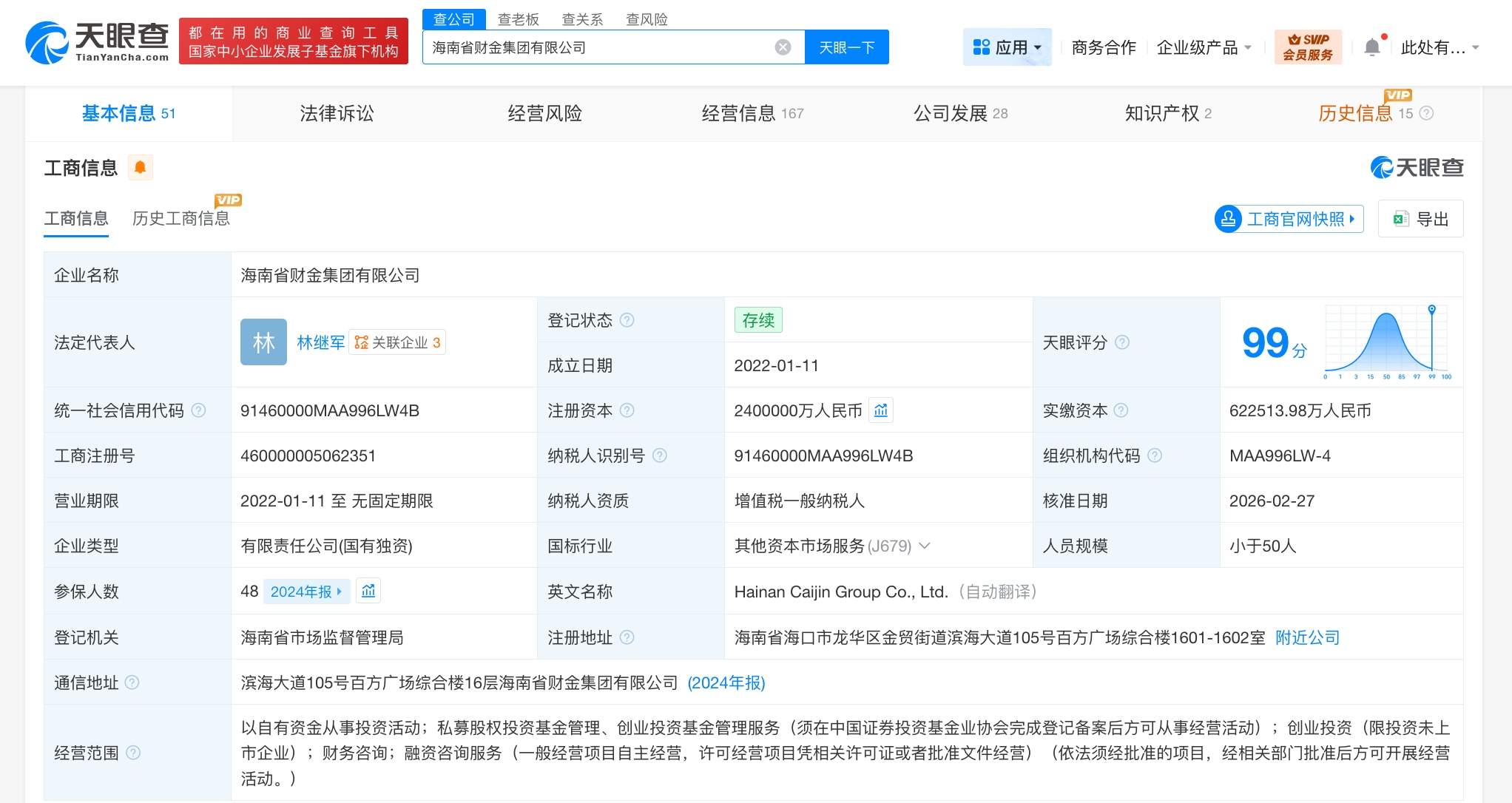 该公司成立于2022年1月,法定代表人为林继军,经营范围为以自有资金从事投资活动,私募股权投资基金管理、创业投资基金管理服务,创业投资,财务咨询,融资咨询服务。股东信息显示,该公司由海南省财政厅全资持股。