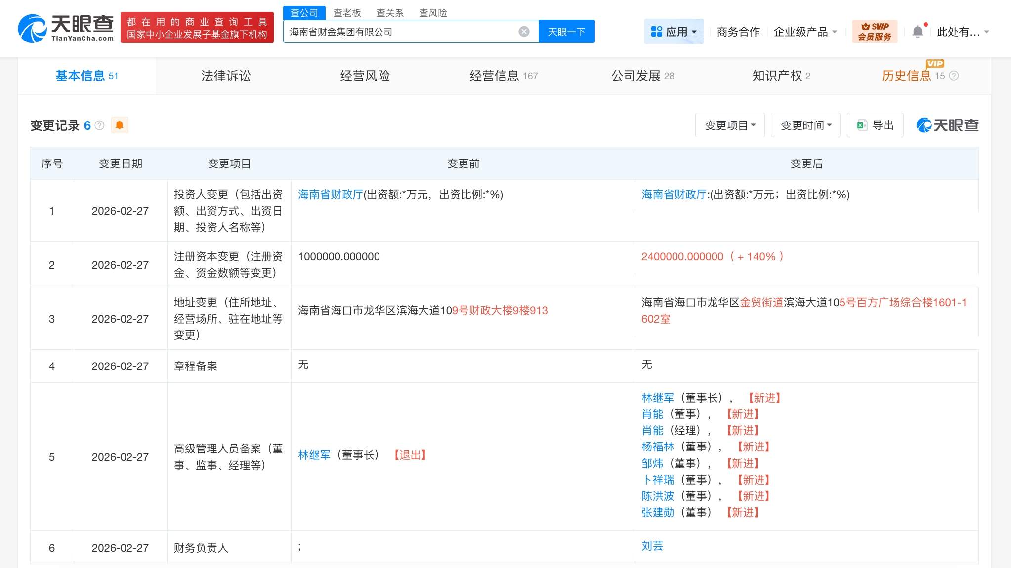天眼查工商信息显示,近日,海南省财金集团有限公司发生工商变更,注册资本由100亿人民币增至240亿人民币,增幅140%,同时,多位高管发生变更。