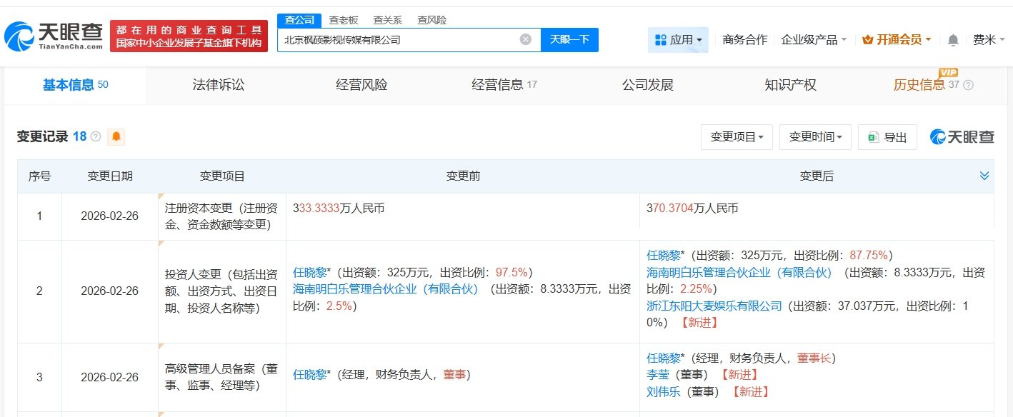天眼查工商信息显示,近日,北京枫硕影视传媒有限公司发生工商变更,新增阿里影业旗下浙江东阳大麦娱乐有限公司为股东,同时注册资本由约333.3万人民币增至约370.4万人民币。